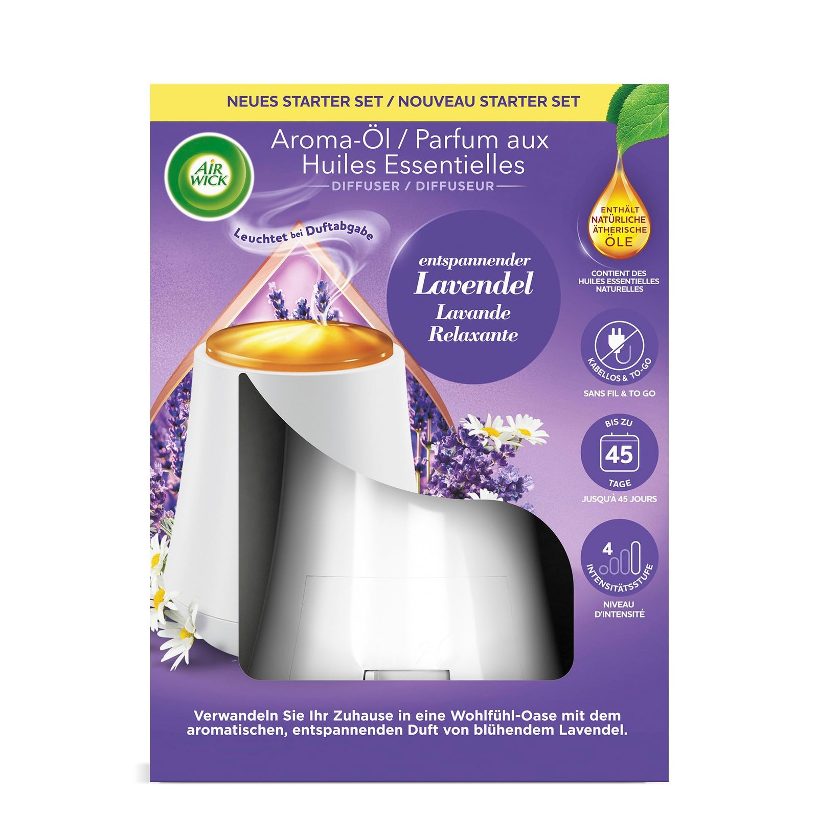Der elegante Air Wick Duftzerstäuber verwandelt die natürlichen ätherischen Öle in feinen Duftnebel & sorgt für eine anhaltend gut riechende Wohnung – Kompaktes Design, ohne Kabel & geräuschlos|Entspannung pur: Der beruhigende Duft von frischem Lavendel schickt die Sinne auf eine Erholungsreise und bringt die Lavendelfelder eines Frankreichurlaubs in jedes Zuhause und Zimmer|Damit für jede Vorliebe die perfekte Intensität gewährleistet ist, lässt sich der wasserlose Vernebler in Zeitintervallen und Duftintensität regulieren – für kleine und große Räume geeignet|Ein Flakon hält bis zu 45 Tage – Duftabgabe erfolgt für 8h, danach wird für 16h der Stand-by Modus aktiviert, bis sich der Zerstäuber automatisch wieder einschaltet / Manuell früher einschaltbar|Lieferumfang: 1 x Air Wick Aroma-Öl Diffusor & 1 x 20ml Duftmischung ätherische Öle, 3 Batterien / Leise, ohne Stromversorgung & Kabel nutzbar / Kompatibel mit den Aroma-Öl Flakons von Air Wick