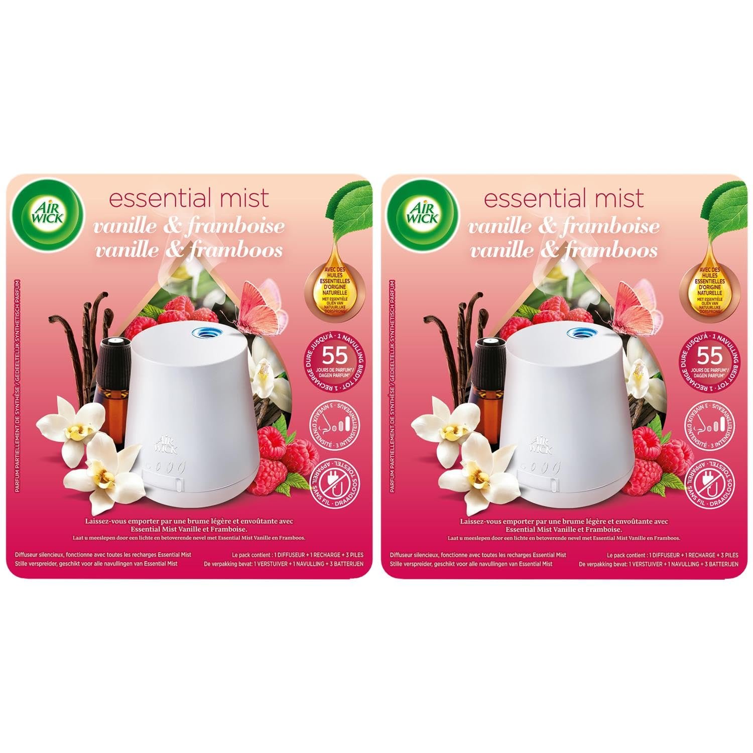 Air Wick Duftspender für ätherische Öle Essential Mist + 1 Nachfüllpack Vanille und Himbeere, 25 ml, 5 Stück
