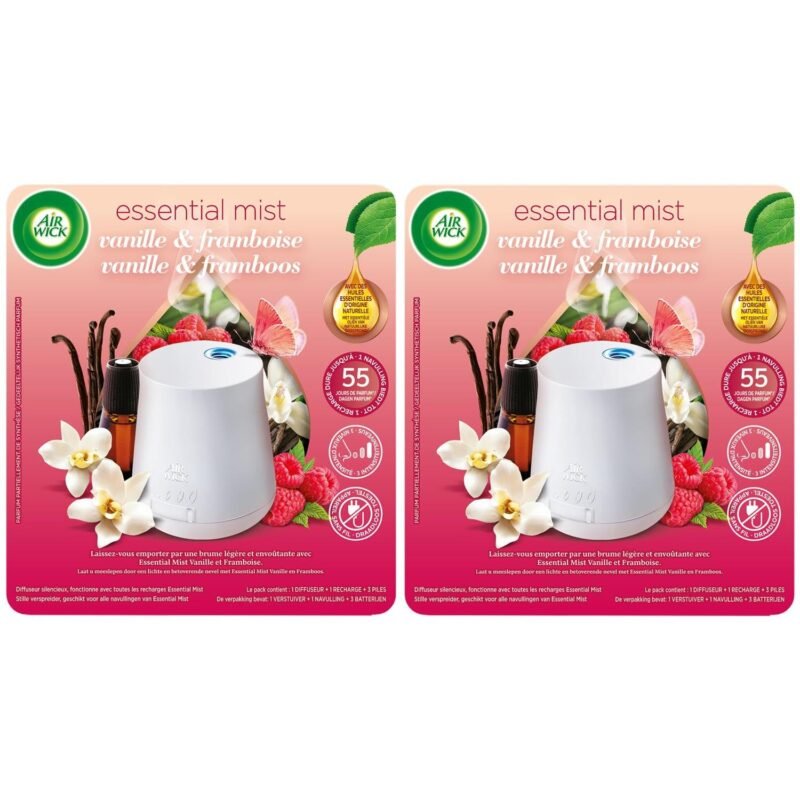 Willkommen auf Ihrer Reise mit Air Wick Essential Mist! Lassen Sie sich von unserem Duftnebel mit ätherischen Ölen entführen, der Ihre Sinne erfreuen wird|Genießen Sie einen angenehmen Duft nach Vanille und Himbeere|Ideal für alle Ihre Räume, egal wie groß sie sind, dank der Möglichkeit, die Diffusionsfrequenz einzustellen|Ätherische Öle natürlichen Ursprungs|Basierend auf der Verwendung des Diffusors in der minimalen Position bietet eine Nachfüllpackung bis zu 55 Tage Duft, funktioniert mit mitgelieferten Batterien