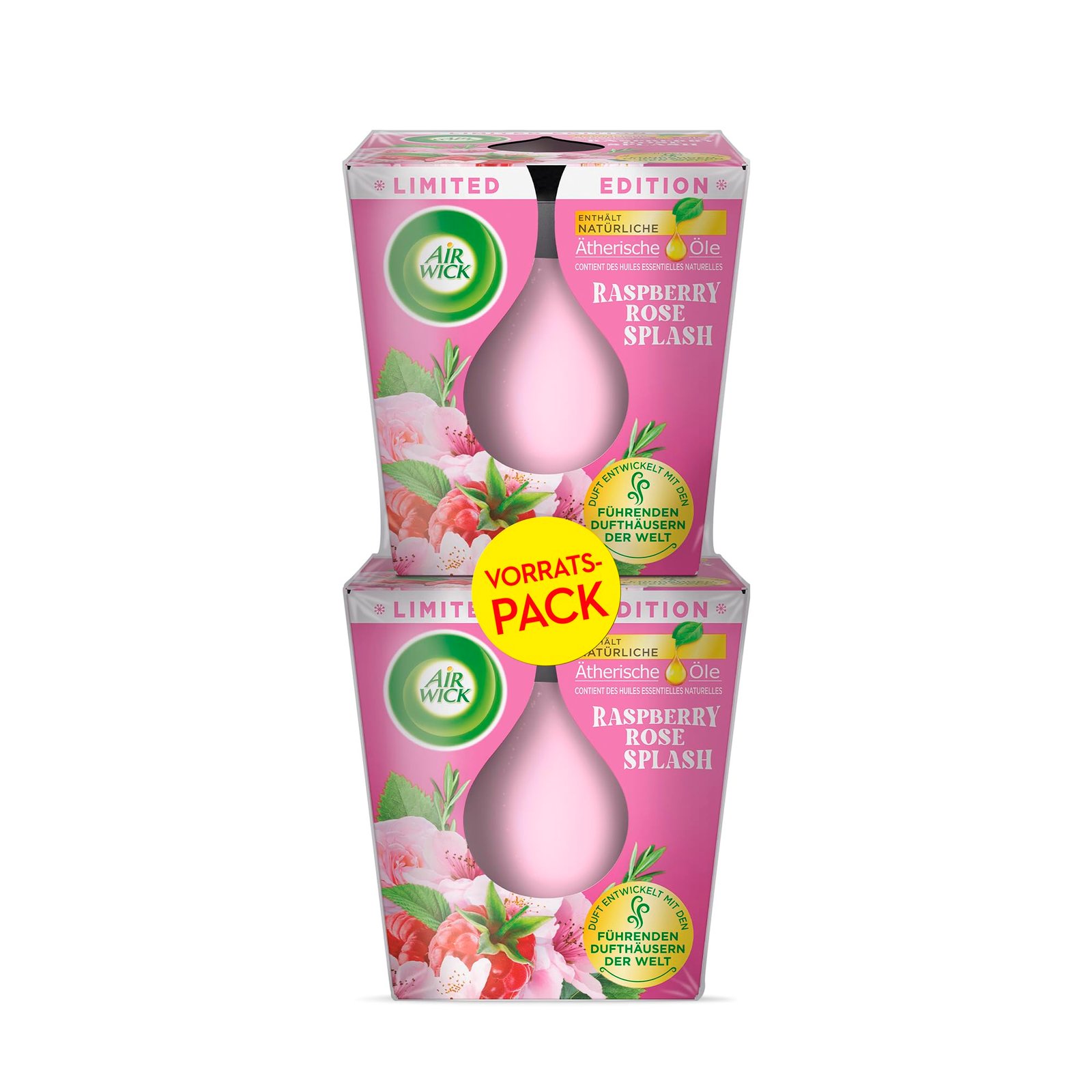 FRUCHTIGER DUFT: Die edle Duftkerze verbreitet ihr intensives Duftöl und verleiht jedem Zuhause den fruchtig-aromatischen Duft von Himbeeren und Rosen / Air Wick Wohlfühl-Duftkerzen passen in jedes Ambiente|ZEITLOSE NATÜRLICHKEIT: Die Aroma-Kerze enthält hochwertige ätherische öle, die den süßen Duft von Himbeeren und Rosen in der Wohnung verströmen|LANGE BRENNDAUER: Die hochwertige Kerze gewährleistet eine lange Brenndauer von bis zu 20h und sorgt so für ein besonders langanhaltendes Entspannungsgefühl – vom ersten bis zum letzten Anzünden|STILVOLLES DESIGN: Die Wohlfühl-Kerze von Air Wick kommt in einem dezenten, satinierten Design-Glas, das sich ideal in die Deko des jeweiligen Raumes einfügt|LIEFERUMFANG: Set mit 2 Wohlfühl-Duftkerzen von Air Wick in der Duftrichtung Raspberry Rose Splash / Im Duo Pack / Raumduft, der in jedem Zimmer der Wohnung eine angenehme Atmosphäre verbreitet