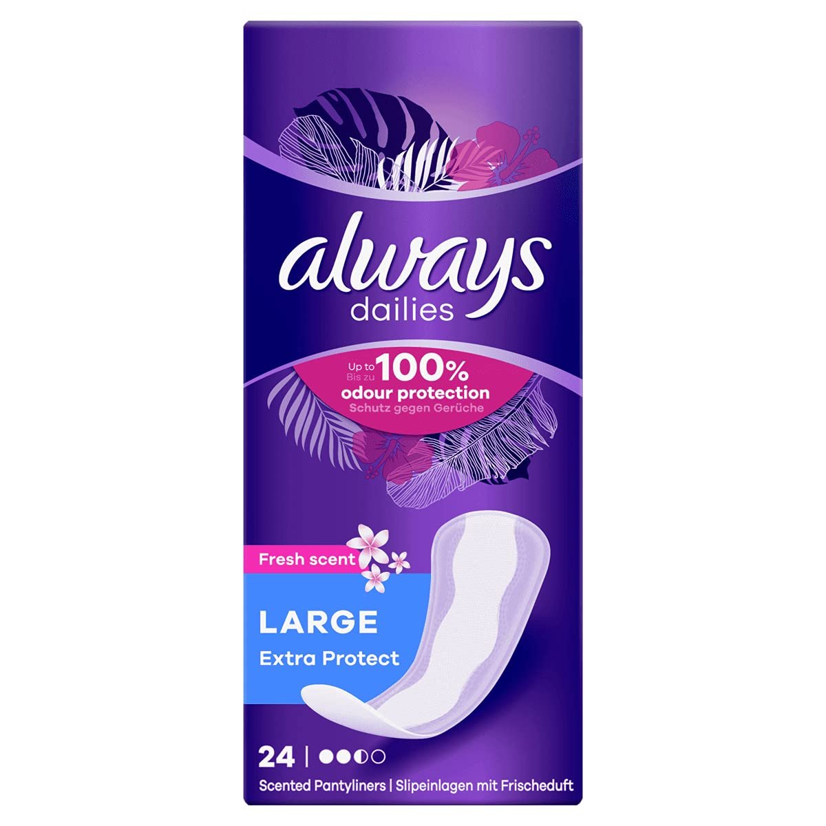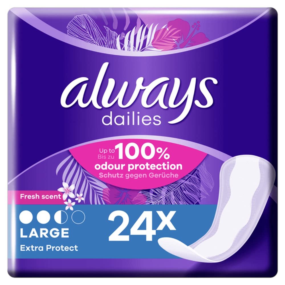 Die geruchsneutralisierende Technologie sorgt dafür, dass Sie sich den ganzen Tag frisch und selbstbewusst fühlen|Slipeinlagen mit beidseitigen Schutzzonen für besseren Schutz vor Auslaufen|Größere Slipeinlagen für zusätzlichen Schutz im Vergleich zu Always Dailies Normal Fresh & Protect|Dermatologisch getestet, sanft zur Haut|Dieses Product enthält: 1 x Always – Dailies Slipeinlagen Large Extra Protect – 24 Stücke