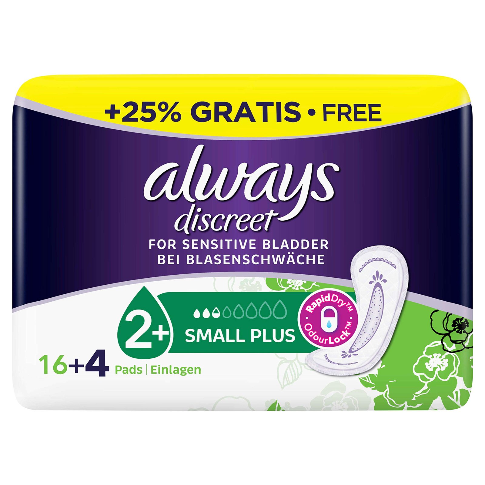Always Discreet bei Blasenschwäche. Mit RapidDry und OdourLock-Schutz|Einzigartiger Kern mit Zweifach-Schutz. Hilft, Gerüche und Feuchtigkeit einzuschließen|Always Discreet Einlagen sind dünn und flexibel – sogar, wenn sie nass sind. Diskrete Passform|Einzeln verpackt. Wiederverschließbar für eine diskrete Entsorgung|Exklusive OdourLock-Technologie, die Gerüche sofort und dauerhaft neutralisiert, leicht parfümiert