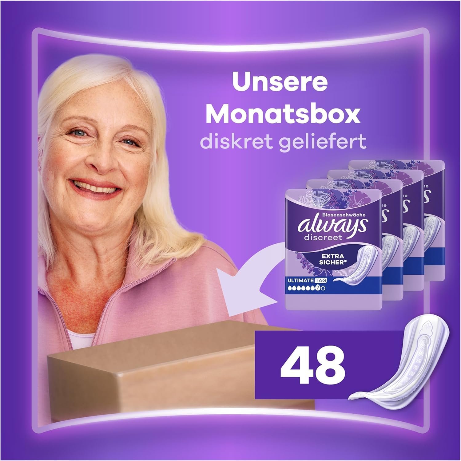 Always Discreet Inkontinenz-Einlagen Ultimate Tag Monatspaket bei Blasenschwäche, 48 Einlagen (4 Packungen x 12 Stück)