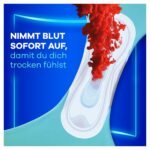 Saugstarke und weiche Oberfläche|3x Schutz für ein frisches und sauberes Gefühl während der Periode|Super saugfähige Binde mit InstantDry-System nimmt Periodenblut sofort auf|LeakGuard-Technologie verhindert Auslaufen|OdourLock-Technologie neutralisiert Gerüche|ComfortLock-Flügel für eine optimale Passform bei jeder Art von Unterwäsche|Packung aus 50% recyceltem Kunststoff|Von Dermatologen der Skin Health Alliance bestätigt