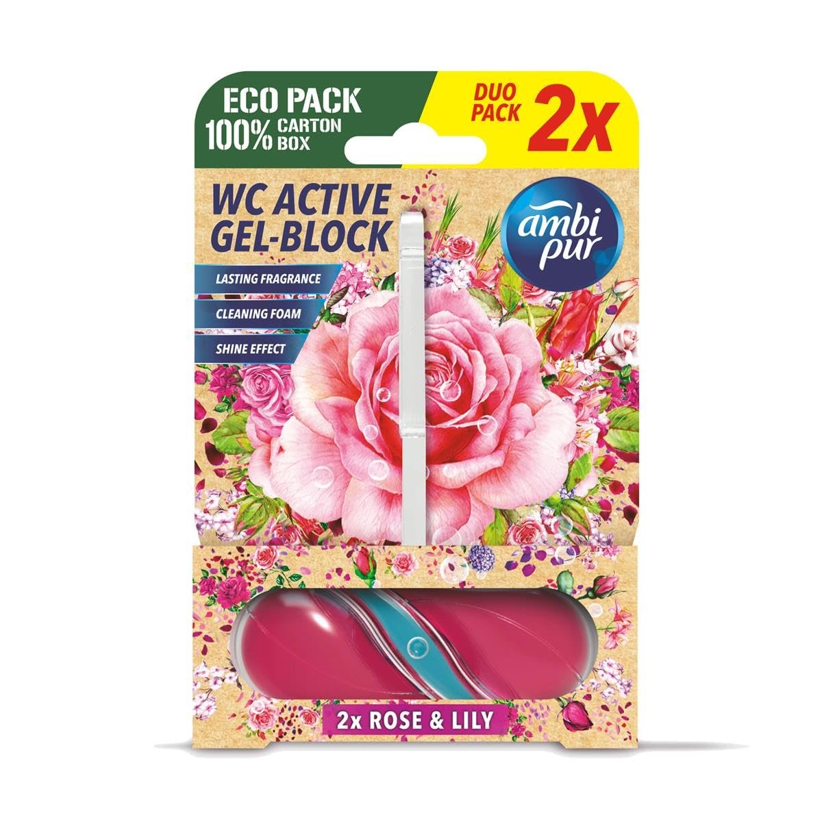 Die Ambi Pur WC Active Gel-Blöcke in der Duftvariante Rose&lily sorgen mit ihrem erfrischenden Duft für langanhaltende Frische in Ihrem Badezimmer. Die praktischen 2x45g Blöcke sind einfach zu verwenden und bekämpfen effektiv unangenehme Gerüche.|Der Rose&lily Duft der Ambi Pur WC Active Gel-Blöcke verwandelt Ihr Badezimmer in eine blühende Oase der Frische. Die hochkonzentrierte Formel sorgt dafür, dass selbst hartnäckige Gerüche keine Chance haben.|Mit nur einem Handgriff platzieren Sie die praktischen 2x45g Blöcke in Ihrer Toilette und genießen langanhaltende Frische – jeden Tag aufs Neue.. Genießen Sie ein sauberes und duftendes WC mit dem Ambi Pur WC Active Gel-Block.|Dank seiner speziellen Formel werden unangenehme Gerüche effektiv neutralisiert und das Spülwasser färbt sich mit jedem Spülvorgang frisch-blau. So haben Sie jeden Tag aufs Neue ein sauberes und duftendes WC-Erlebnis.|Damit erleben Sie dauerhaft hygienische Frische im Badezimmer.Gönnen Sie sich und Ihren Gästen diese angenehme Atmosphäre in Ihrem Badezimmer. So wird Ihr Badezimmer zu einer Wohlfühloase, in der Sie und Ihre Gäste sich rundum wohl fühlen können.