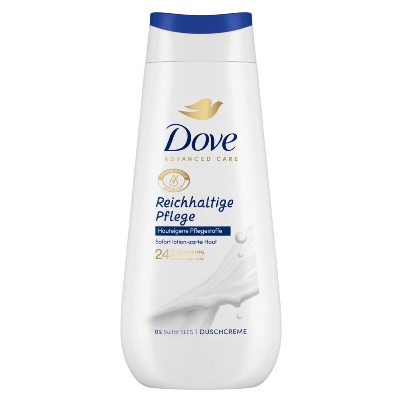 Die Dove Advanced Care Duschcreme Reichhaltige Pflege sorgt für 24h lotion-zarte Haut|Die Dove Duschcreme enthält Millionen kleinster MicroMoisture-Tropfen für ein seidig-weiches Hautgefühl|Dank pflanzenbasierten Feuchtigkeitsspendern und hauteigener Pflegestoffe regeneriert die Duschcreme von Dove die natürliche Feuchtigkeit der Haut|Die pflegende Duschcreme ist mild zum Hautmikrobiom|Duschcreme mit 0% Sulfat SLES und bis zu 98% biologisch abbaubarer Formel gemäß OECD-Methoden