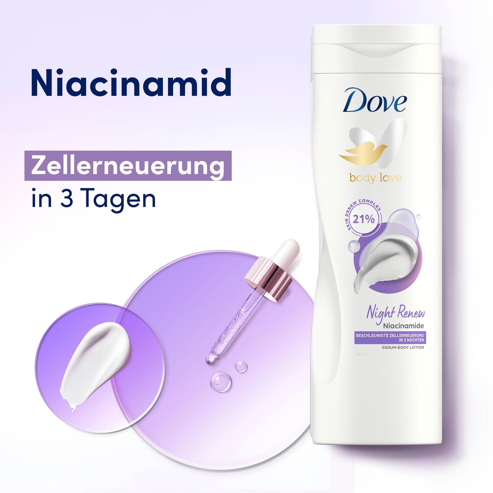 Dove Body Love Serum Body Lotion Night Renew mit 21% Skin Renew Complex spendet bis zu 72 Stunden Feuchtigkeit und regeneriert die Haut|Die Körper Lotion mit 21% Skin Renew Complex sorgt für eine beschleunigte Zellerneuerung der Haut innerhalb von 3 Nächten|Die Dove Körperpflege enthält Niacinamide und aktiv wirkende Inhaltsstoffe, inspiriert von der Gesichtspflege|Die effektive Formel der Serum Body Lotion mit Vitamin B3 dringt tief in die oberste Hautschicht ein und unterstützt so den Hauterneuerungsprozess|Die Flasche der Body Lotion besteht zu 100% aus recyceltem Plastik (ohne Kappe und Etikett)|Dove ist von PETA zertifiziert und unsere Body Lotion und Pflegeprodukte tragen jetzt das PETA vegan approved Logo