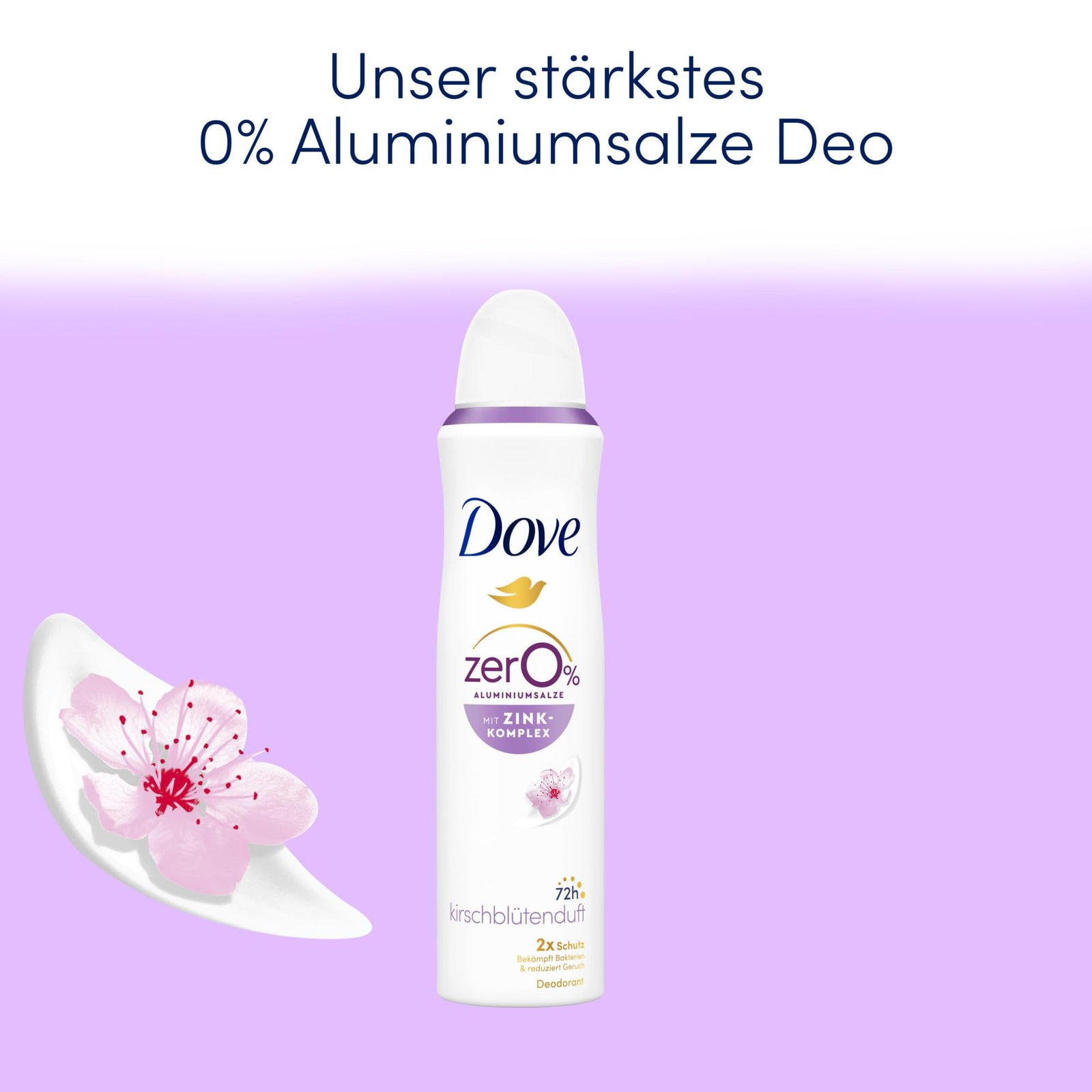 Dove Deo-Spray mit Kirschblütenduft und pflegendem Zink-Komplex bietet zweifachen Schutz, bekämpft geruchsverursachende Bakterien und reduziert Gerüche|Das Deodorant ohne Aluminiumsalze ist besonders sanft zu zarter Achselhaut und enthält 1⁄4 Pflegecreme|Unser stärkstes 0% Aluminiumsalze Deo bewahrt 72 Stunden lang vor unangenehmen Körpergerüchen|Ein pflegendes Deo mit einem frischen Duft nach zarten Kirschblüten|Das Aluminium der Deodorant-Spray Dosen ist unendlich oft recycelbar|Die Formeln der Dove Deos mit Zink-Komplex sind ohne Inhaltsstoffe tierischen Ursprungs und als „PETA-vegan“ zertifiziert (weitere Informationen auf der Dove Webseite)