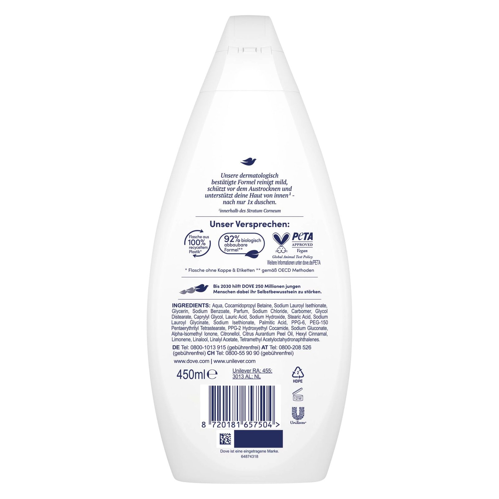 Die Dove Pflegedusche Samt-Weich reinigt mild, schützt vor dem Austrocknen und unterstützt die Haut von innen* nach nur 1x Duschen|Die Dove Pflegedusche Samt-Weich sorgt für eine weichere Haut|Dank pflanzenbasierten Feuchtigkeitsspendern und intensiver Pflege erhält das Duschgel von Dove die natürliche Feuchtigkeit der Haut|Das Duschgel Samt-Weich wirkt sofort und entspannt trockene Haut bereits nach dem ersten Duschen|Duschbad mit 0% Sulfat SLES und bis zu 92% biologisch abbaubarer Formel gemäß OECD-Methoden|Die Duschgele von Dove sind PETA-vegan approved und die Flaschen sind aus 100% recyceltem Plastik (ohne Kappen und Etiketten)