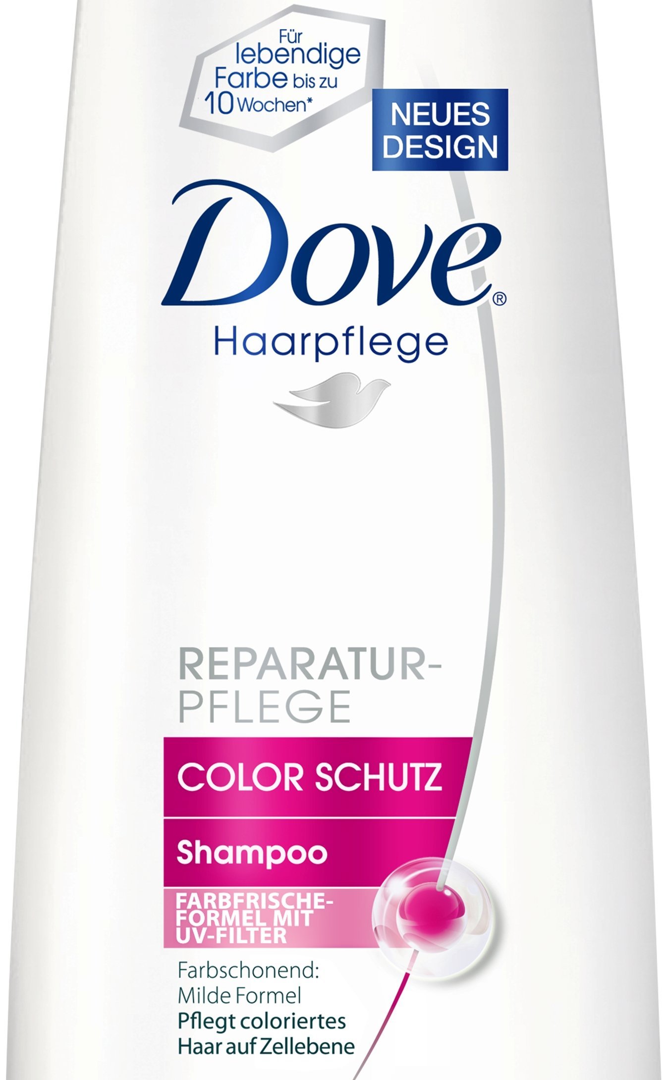 Die professionelle Pflege und Reparatur von Dove:|Die Formel mit MICRO-MOISTURE-SERUM und FIBRE-ACTIVES repariert die Haaroberfläche.|Es hilft, die Farbe länger* einzuschließen.|Für schönes Haar mit länger* anhaltender Farbbrillanz.