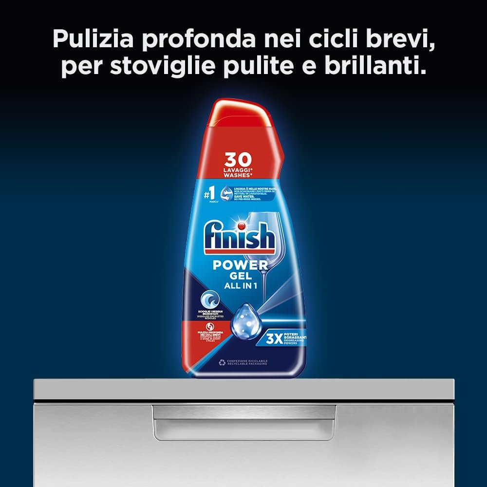 Finish All-in-1 Max-Powergel, Flasche für 30 Waschgänge, Entfettungskraft|FINISH POWERGEL Geschirrspülmittel kombiniert die Reinigungswirkung von Finish mit einer schnell löslichen Gel-Formel|Die Wirkungen – Finish Powergel Entfettungskraft Fresh, löst verkrustete Rückstände ab 24 Stunden, greift Fett an, fängt es ein und entfernt es vom Geschirr und verhindert, dass es sich auf dem Geschirr wieder ablagert|Die Formel – die schnell lösliche Formel sorgt für erstaunliche Sauberkeit und Glanz! Seine entfettende und erfrischende Formel wirkt gegen hartnäckige Rückstände und sorgt für hervorragende Ergebnisse|Das Ergebnis Finish – Finish ist die Marke Nr. 1 für brillante Ergebnisse auch bei kurzen Zyklen Quelle: Nielsen Homescan, Totale Italien, Produkte für Spülmaschine, AT 9 September 2020|Einheiten: 30.0