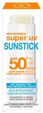 Der Super UV Sunstick bietet dank LSF 50+ einen sehr hohen Schutz vor UVA, UVB und langwelligem UVA|Die nicht klebende und nicht fettende Formel enthält Vitamin E und Shea Butter für Feuchtigkeit und eine antioxidative Wirkung|Der Sunstick spendet bis zu 8 Stunden Feuchtigkeit und eignet sich dank einfacher Anwendung optimal für unterwegs|Schützt die Haut bereits beim ersten Auftragen, ohne weiße Spuren zu hinterlassen|Der non-komedogene Stick eignet sich vor allem für Gesicht, Lippen und der Sonne stark ausgesetzte Bereiche