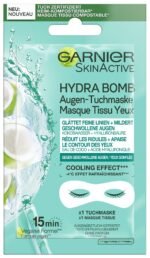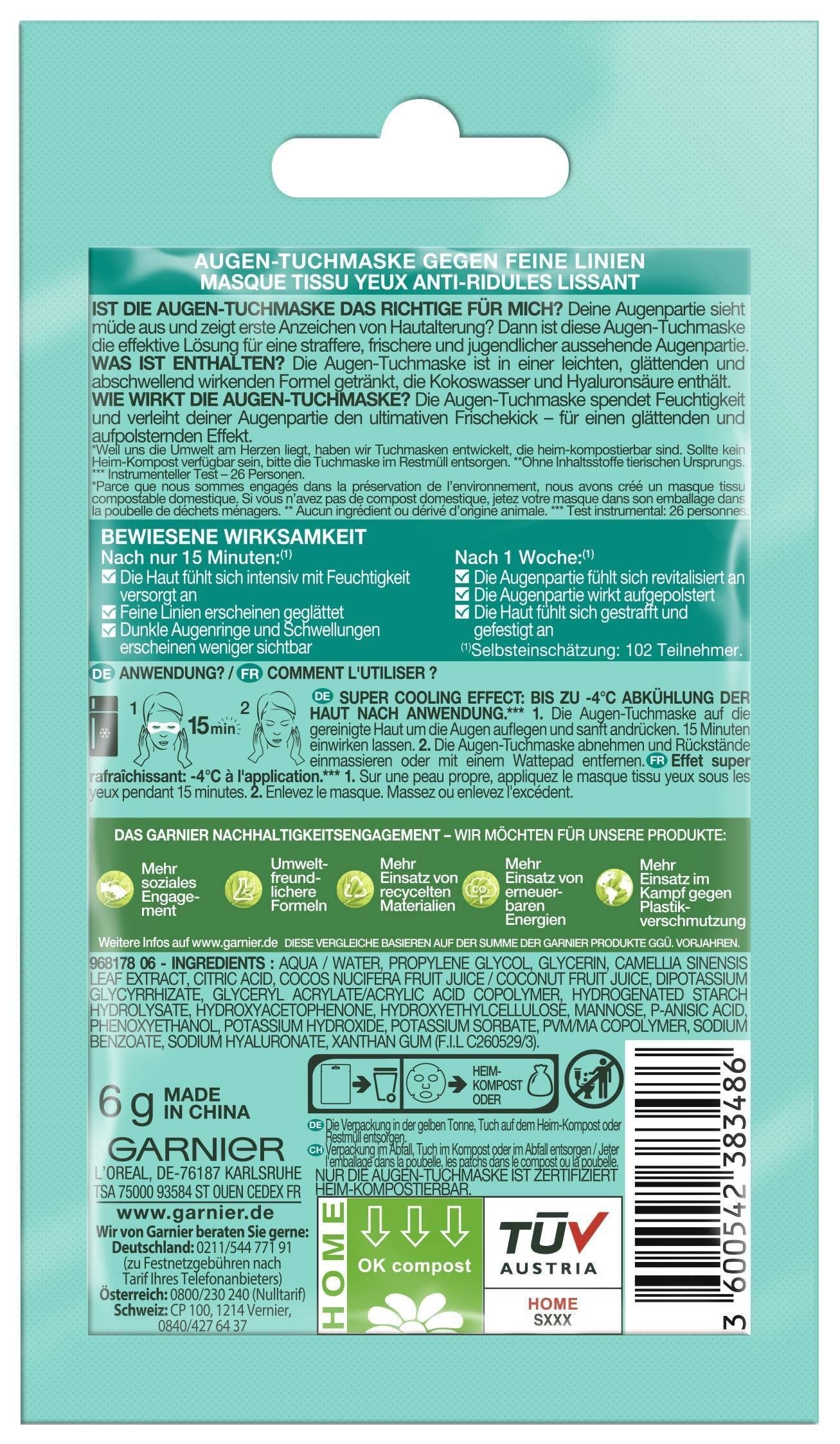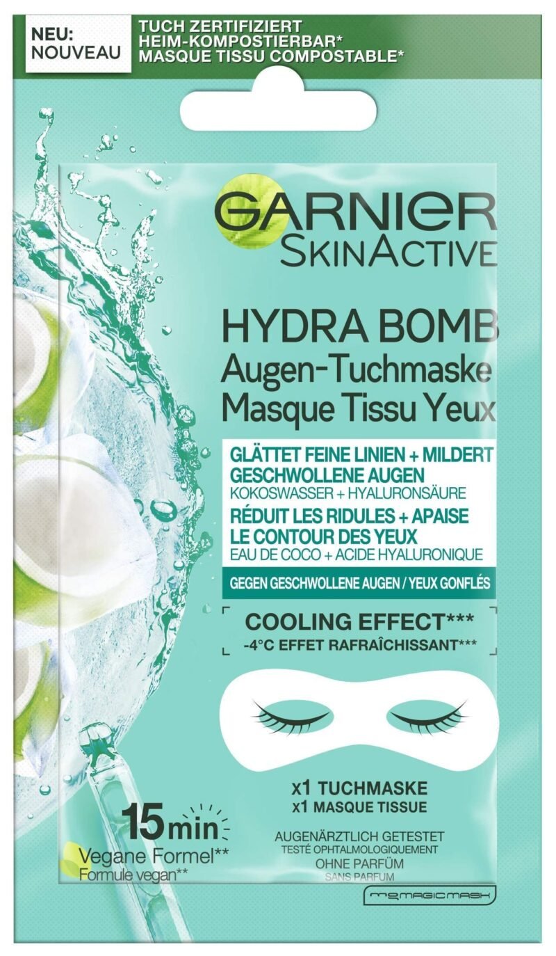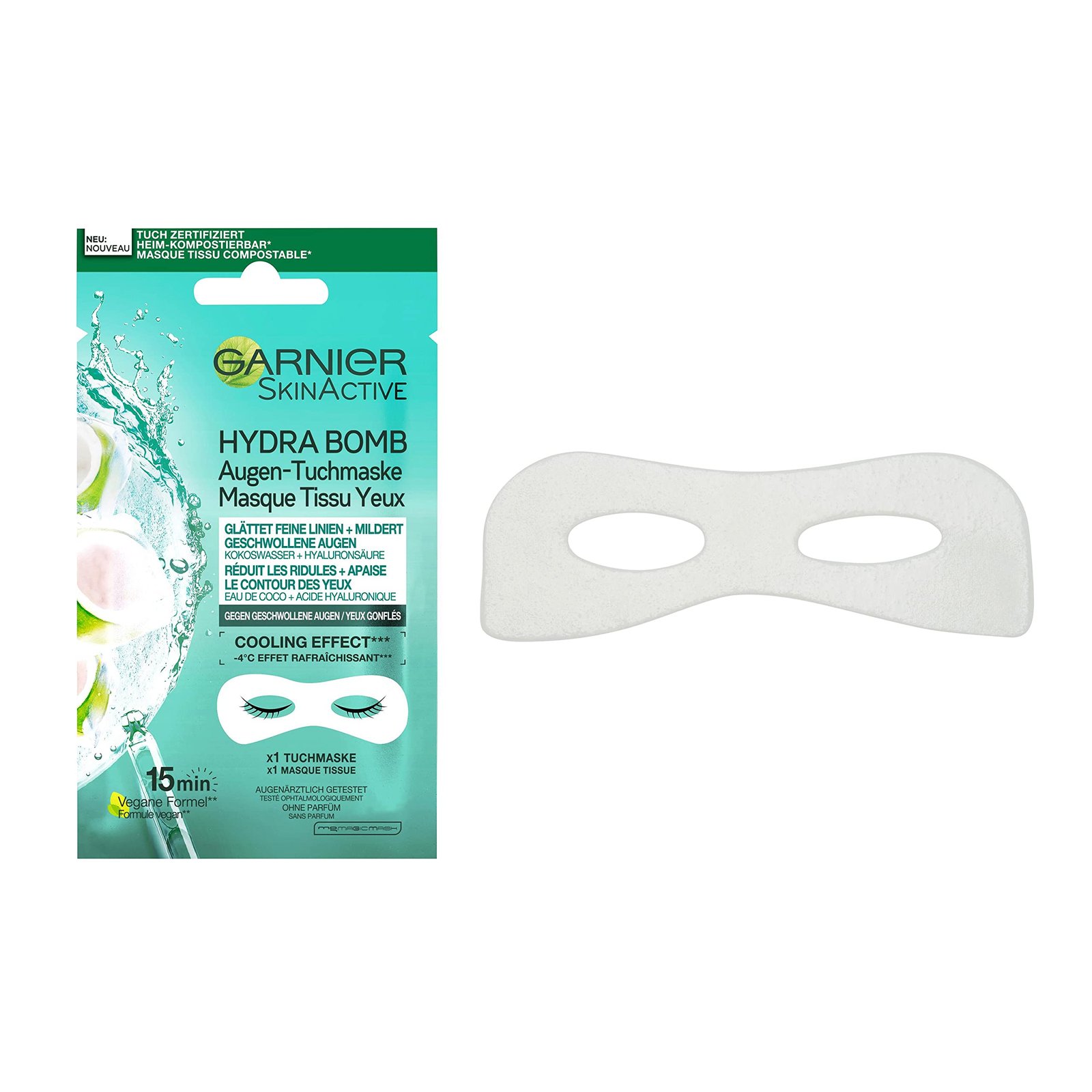 Garnier Hydra Bomb Augen-Tuchmaske gegen geschwollene Augen, Anpassung an jede Gesichtskontur, Aus natürlichem Baumwollgewebe|Ergebnis: Intensive Feuchtigkeit für die Augenkonturen, Milderung geschwollener Augen, Aufpolsternder Effekt, Bis zu -4 Grad Abkühlung der Haut nach der Anwendung|Anwendung: Nach Aufbewahrung im Kühlschrank die Maske mit weißer Folie nach außen auf das gereinigte Gesicht legen, Entfernen der Folie, Anpassen der Maske an die Konturen und 15 Minuten einwirken lassen, Nach dem Abnehmen sanftes Einmassieren der Rückstände|Vegane Formel mit Kokoswasser und Hyaluronsäure, Ohne Parfüm, Augenärztlich getestet, Sichtbare Ergebnisse nach 15 Minuten Einwirkzeit|Lieferumfang: 1x Garnier SkinActive Hydra Bomb Augen-Tuchmaske mit Kokoswasser und Hyaluronsäure, 6 g