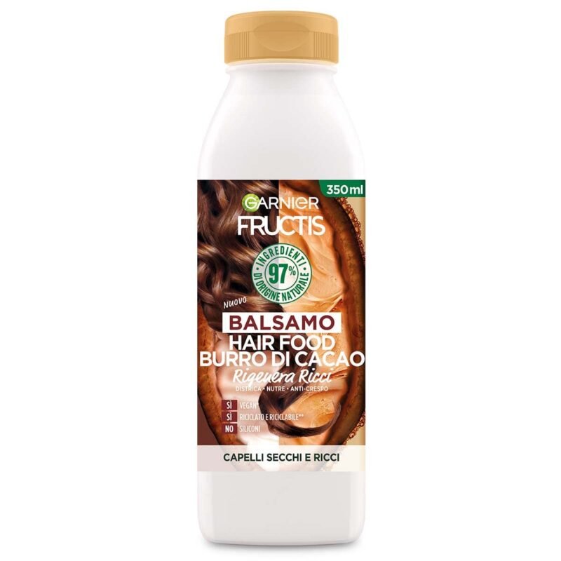 Regenerierender und entwirrender Conditioner mit Kakaobutter-Extrakt, ideal für trockenes und lockiges Haar|Für sofort gepflegte, reparierte und gefederte Locken. Für ein regeneriertes Haar ohne Knoten, nicht beschwert|Anwendungsempfehlung: Auf das nasse Haar auftragen, einmassieren und ausspülen|Ultraleichte Formel mit 97% natürlichen Inhaltsstoffen und ohne Silikone, nährt und enthärtet das Haar und umhüllt es in einen süßen Duft|Inhalt: 1x Hair Food Garnier Shampoo, regenerierende Kakaobutter, Formel 97% natürlichen Ursprungs und ohne Silikone, 350ml