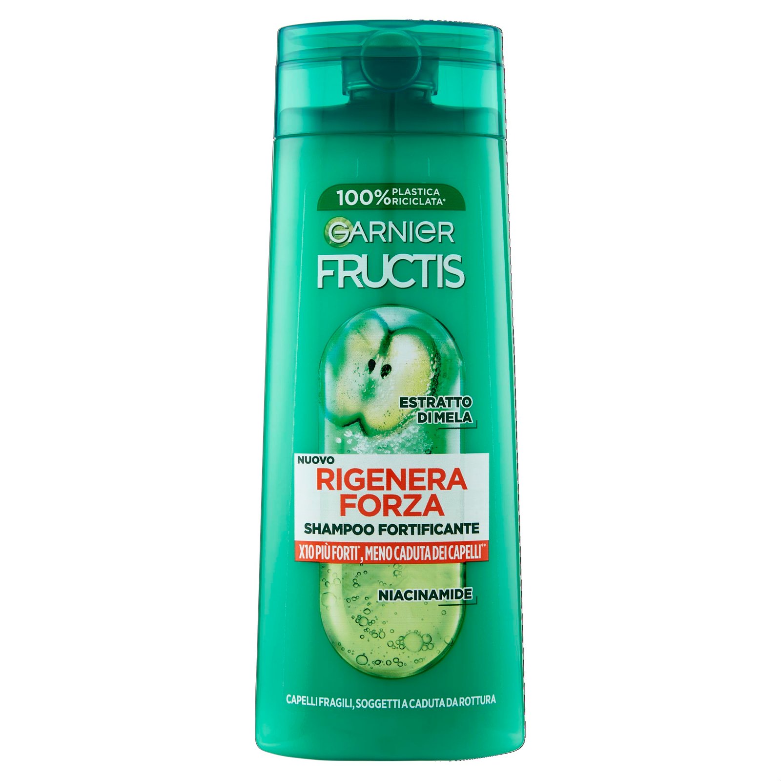 Stärkendes Shampoo für sprödes Haar, das zu Haarausfall neigt, verleiht dem Haar ein vitaleres und strahlendes Aussehen, regeneriert die Stärke der Haarfaser|Das Haar wird sofort genährt, glänzend und weich, 10 mal stärker* und gesünder aussehend *Instrumententaltest nach dem Auftragen von Shampoo und Conditioner|Auf das nasse Haar auftragen und ausspülen. Für eine komplette Routine mit dem Pflegespülung fortfahren|Formel angereichert mit Apfelextrakt, um dem Haar ein vitaleres und strahlenderes Aussehen zu verleihen, und Niacinamid, das die Haarfaser regeneriert und Haarausfall durch Bruch reduziert|Inhalt: 1 x Garnier Fructis Stärkendes Shampoo für sprödes Haar, bruchsicher, stärkende Wirkung, mit Apfelextrakt und Niacinamid, regeneriert Kraft, 250 ml