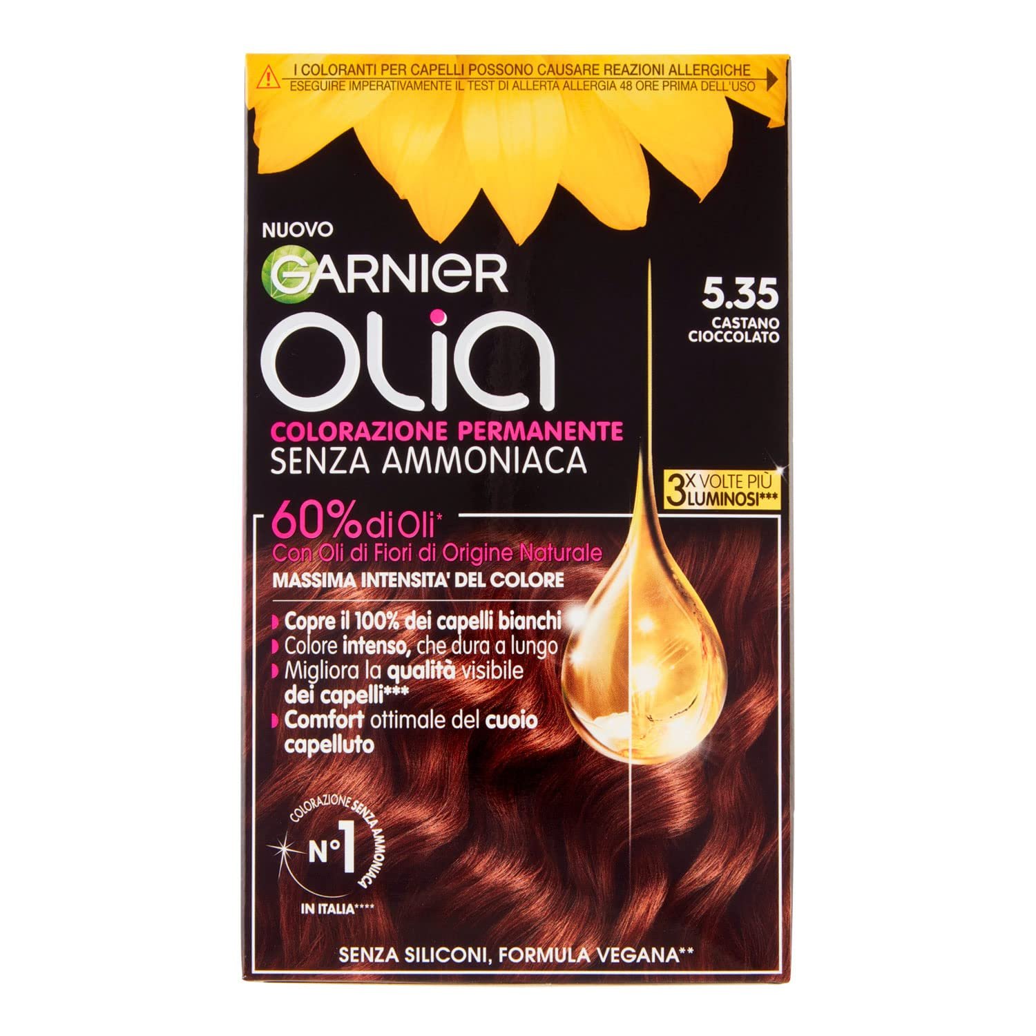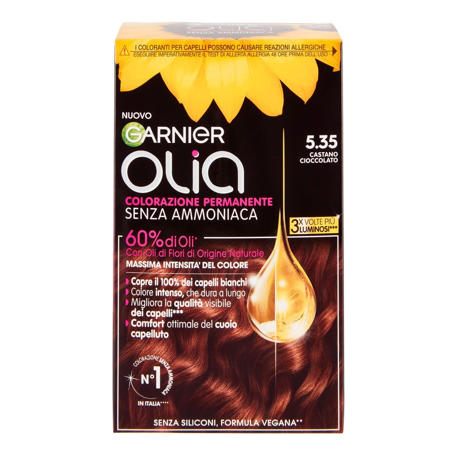 Garnier Olia, Permanente Haarfarbe mit Blütenölen natürlichen Ursprungs, leichter und angenehmer blumiger Duft, samtige Creme, die nicht tropft, ultra-sensorische Anwendung|Für eine langanhaltende, intensive Farbe, deckt 100% weißes Haar ab, weicheres und glänzendes Haar, optimaler Komfort der Kopfhaut|Anwendungsempfehlung: Auf die Bereiche auftragen, wo das Haar weißer ist, 30 Minuten einwirken lassen, mit warmem Wasser abspülen und den Glanz & Seide Conditioner auftragen, 48 Stunden vor Gebrauch den Allergietest durchführen|O.D.S-Technologie: Färbung aus 60 % Ölen, die die Farbe im Inneren der Haarfaser infundieren, vegane Formel, ohne Silikone, ohne Ammoniak|Inhalt: 1 x Garnier Olia Haarfarbe, Farbe: Schokoladenbraun, Das Set enthält: 1 Detektor, 1 Tube Farbstoff, 1 Conditioner Licht & Seide ohne Silikone