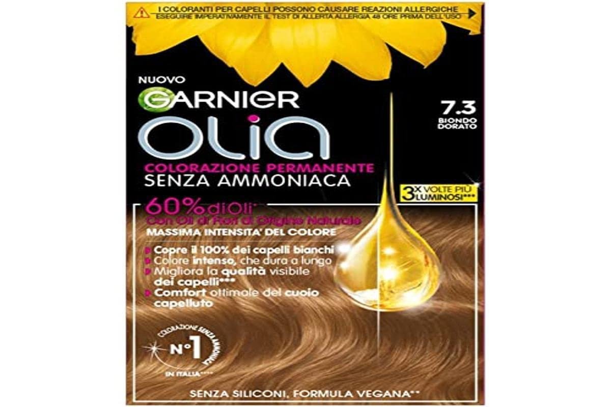 Garnier Olia, Permanente Haarfarbe mit Blütenölen natürlichen Ursprungs, leichter und angenehmer blumiger Duft, samtige Creme, die nicht tropft, ultra-sensorische Anwendung|Für eine langanhaltende, intensive Farbe, deckt 100% weißes Haar ab, weicheres und glänzendes Haar, optimaler Komfort der Kopfhaut|Anwendungsempfehlung: Auf die Bereiche auftragen, wo das Haar weißer ist, 30 Minuten einwirken lassen, mit warmem Wasser abspülen und den Glanz & Seide Conditioner auftragen, 48 Stunden vor Gebrauch den Allergietest durchführen|O.D.S-Technologie: Färbung aus 60 % Ölen, die die Farbe im Inneren der Haarfaser infundieren, vegane Formel, ohne Silikone, ohne Ammoniak|Inhalt: 1 x Garnier Olia Haarfarbe, Farbe: Goldblond, Das Set beinhaltet: 1 x Detektor Creme, 1 x Farbtube 1 x Conditioner Licht & Seide ohne Silikone