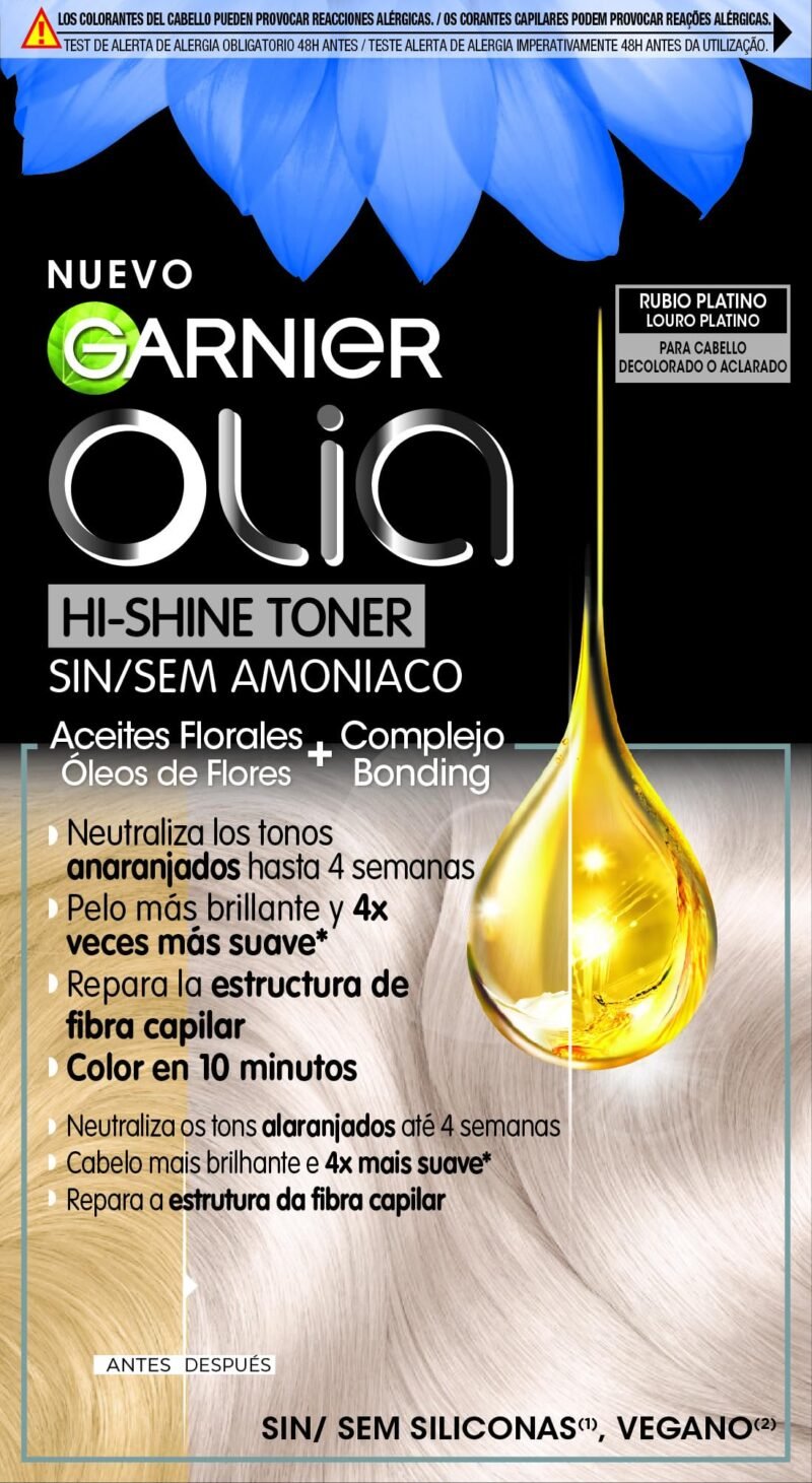 Olia Hi-Shine Toner neutralisiert unerwünschte Töne auf gebleichtem, aufgehelltem oder gesträhntem Haar in nur 10 Minuten.|Die ausgleichende Lotion neutralisiert dank ihrer kalten Pigmente sofort Orange- und Gelbtöne und hinterlässt ein strahlendes Blond mit 2x mehr Glanz|Maße: 5,5 x 9,5 x 17 cm|Referenz: S05121830|Garnier Olia Hi-Shine