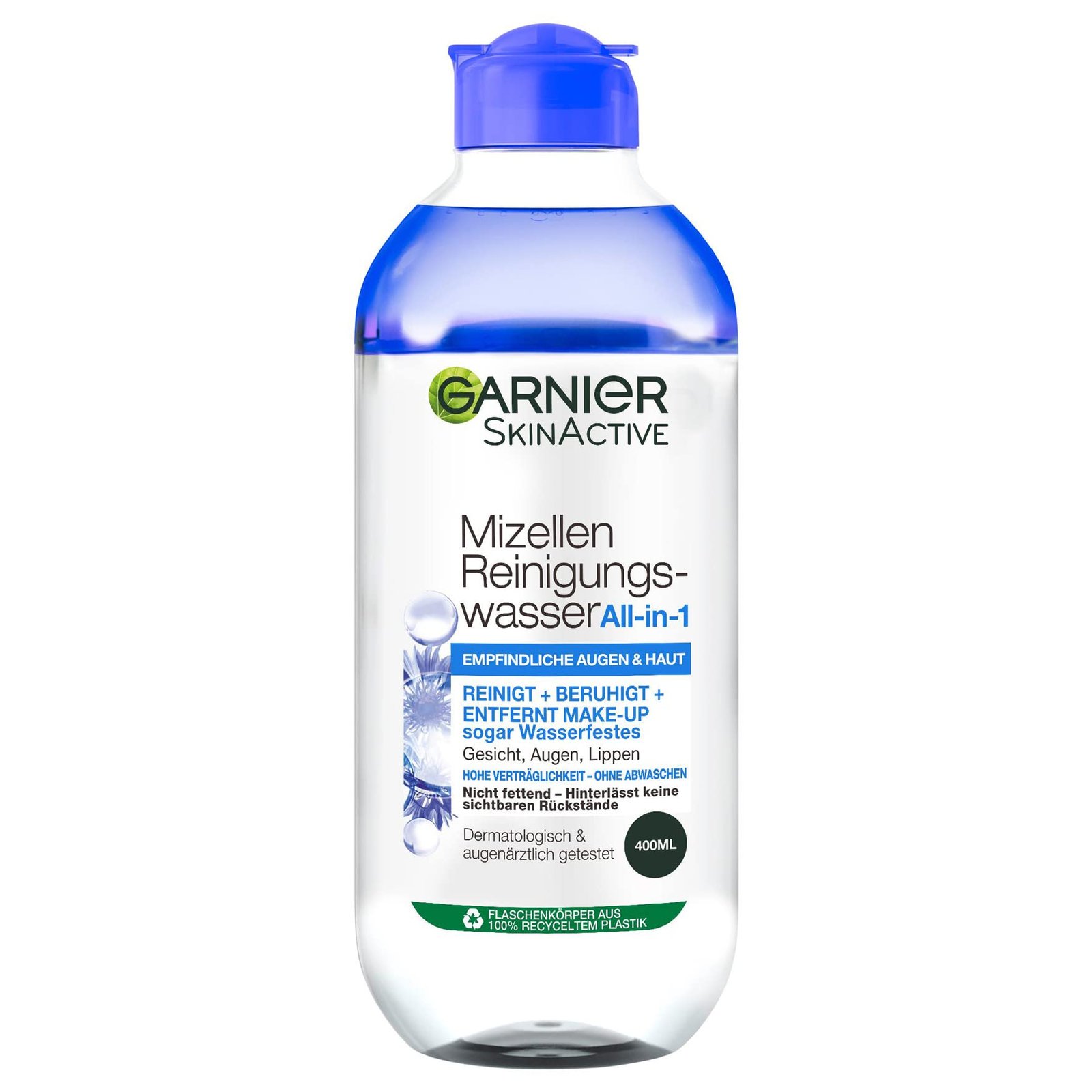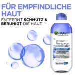 Reinigendes Gesichtswasser mit Mizellen-Reinigungs-Technologie und Glycerin für besonders empfindliche Haut, Zur Entfernung von wasserfestem Makeup und Schmutz|Ergebnis: Gereinigte, hydratisierte Haut und entspannte, beruhigte Augenpartie, Ideal vorbereitete Haut für nachfolgende Gesichtscreme|Anwendung: Morgens und abends Cleanser auf ein Wattepad geben und sanft über Gesicht, Augen und Lippen streichen, Kein Reiben oder Abspülen nötig|Hohe Verträglichkeit für Gesicht, Augen und Lippen dermatologisch und augenärztlich getestet, Auch für Kontaktlinsenträger geeignet|Lieferumfang: 1x Garnier Skin Active Mizellen Reinigungswasser All-in-1 speziell für empfindliche Haut und Augen, Inhalt: 400 ml