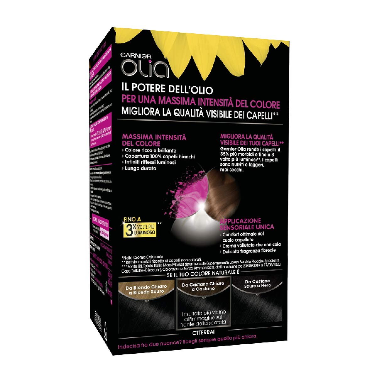 Haarfarbe mit Blütenölen natürlichen Ursprungs für eine intensive und langanhaltende Farbe, sichtbar verbesserte Haarqualität und optimalen Komfort der Kopfhaut|Für leichtes, gepflegtes und vor dem Austrocknen geschütztes Haar, 100% Abdeckung von weißem Haar, intensive und gleichmäßige Farbe, reich an Reflexen|Gebrauchsanweisung: Führen Sie den 48-Stunden-Allergietest vor Gebrauch durch. Lesen Sie die Anleitung vor jeder Anwendung sorgfältig durch. Empfohlene Menge: 1 Box (mittellanges Haar), 2 Schachteln (langes Haar)|Samtige Creme, die nicht tropft, Formel ohne Ammoniak für einen leichten und angenehmen blumigen Duft, O.D.S-Technologie: Färbung aus 60 % Ölen, die die Farbe im Herzen des Haares übertragen|Inhalt: 1 x Dose für permanente Haarfarbe Garnier Olia, Farbe: Dunkelbraun (4.12), beinhaltet: Handschuhe, Ampulle, Creme-Detektor, Farbcreme, Balsam und Packungsbeilage