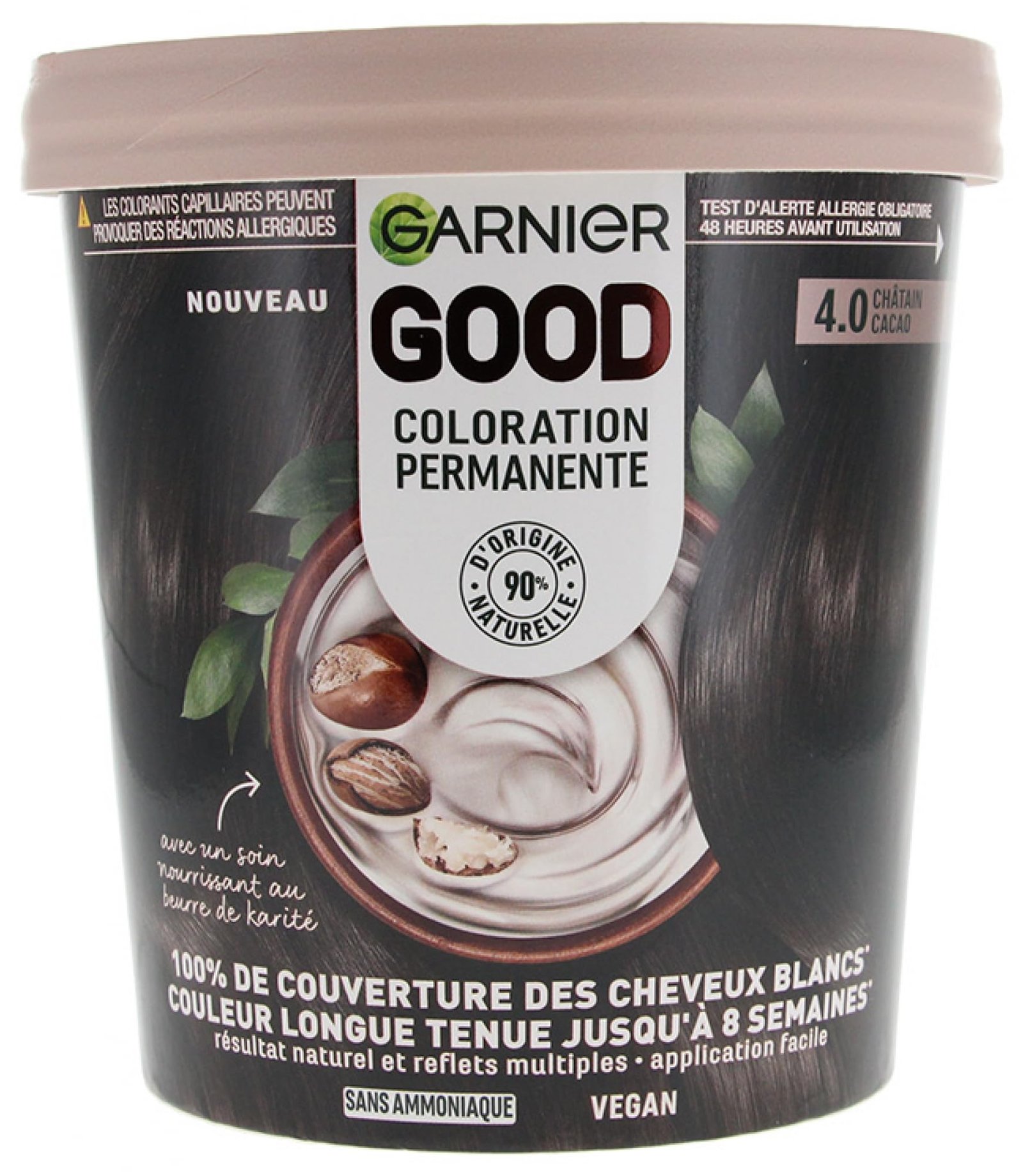 Permanente Haarfarbe mit cremiger Textur und ohne Ammoniak, lang anhaltend und hohe Deckkraft, mit einer mit Sheabutter angereicherten Pflege für das Haar|Ergebnisse: Ein natürliches Ergebnis mit mehreren Reflexen, hält bis zu 8 Wochen*, 100 % Abdeckung von weißem Haar (*Instrumentelltests)|Anwendungshinweise: Sensorische Anwendung per Hand (mit den Handschuhen im Lieferumfang enthalten) als Maske, lesen Sie die Anleitung vor der Anwendung sorgfältig durch und führen Sie einen Allergietest 48 Stunden durch|Vegane Formel** besteht zu 90 % aus Inhaltsstoffen natürlichen Ursprungs und umweltfreundlichem Topf (45 % weniger Kunststoff als andere. Garnier Classic Set), **keine Inhaltsstoffe tierischen Ursprungs oder Derivate|Inhalt: 1 x Garnier Good, Kakaobraun (4.0), Enthaltene Creme, Farbcreme, pflegende Pflege mit Sheabutter, Handschuhe, Spatel und Gebrauchsanweisung