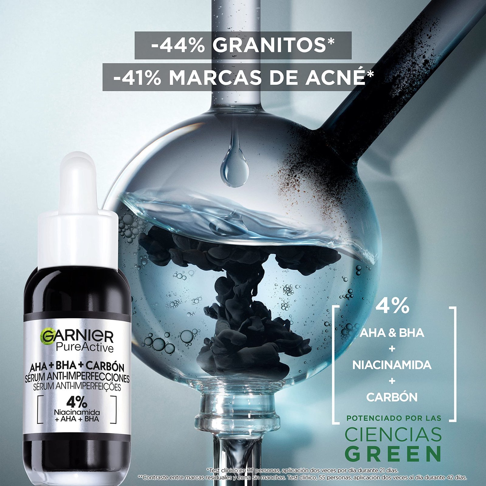 Entdecken Sie das neue schwarze Anti-Unvollkommenheitsserum mit Niacinamid+AHA+BHA von Garnier PURE AKTIV und verabschieden Sie sich von Hautunreinheiten, Pickeln und Mitessern|Unser 1. Schwarzes Unisex-Serum mit einer Konzentration von 4 % [NiACINAMID + AHA + BHA] reduziert Pickel, Flecken und Unvollkommenheiten für ein glatteres und ebenmäßigeres Hautbild|Klinisch nachgewiesene Ergebnisse innerhalb von 28 Tagen. – Nach der 1. Anwendung wird die Haut weicher und glatter – In 7 Tagen erscheint die Hautstruktur verfeinert und der Ton gleichmäßiger. – Nach 28 Tagen erscheinen Pickel, Mitesser, Rötungen und Unvollkommenheiten sichtbar reduziert. Bewährte Wirksamkeit** **Selbsteinschätzung bei 155 Personen|Das schwarze Serum auf das gereinigte Gesicht auftragen und sanft in die Haut einmassieren. Morgens und abends als diarisches Serum verwenden oder direkt auf die Flecken auftragen. Verhindert die Augenpartie|Vegane Formel ohne Inhaltsstoffe oder Derivate tierischen Ursprungs.|Offiziell genehmigt von Cruelty Free International