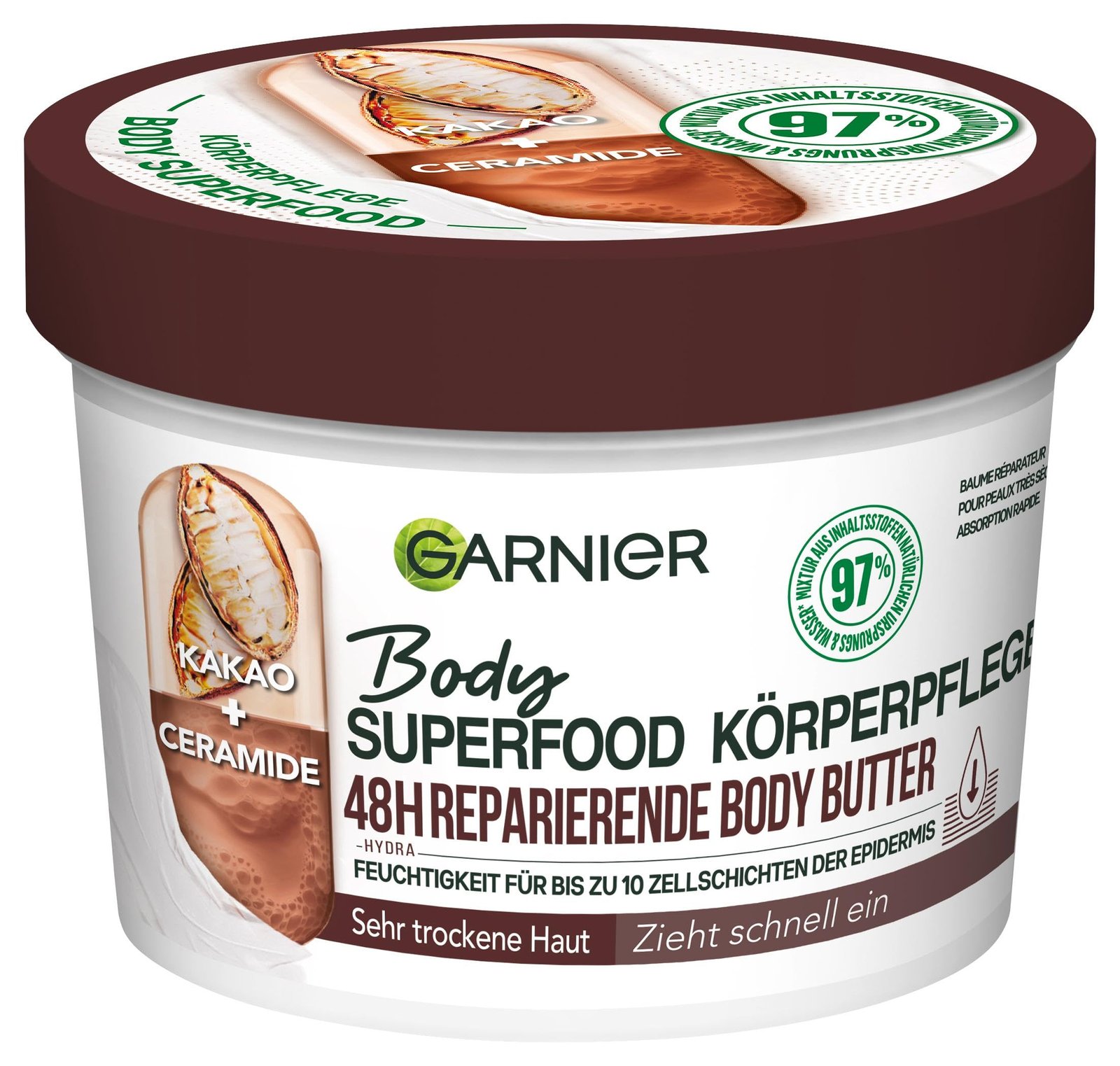 Reparierende Superfood Körperpflege für 48 Stunden intensive Feuchtigkeitsversorgung, Nährende Body Butter mit Kakaobutter und Ceramiden für sehr trockene Haut|Wirkung: Aktive Stärkung der Hautschutzbarriere für widerstandsfähige Haut, Langanhaltend geschmeidige und glatte Haut, Angenehmes und gepflegtes Hautgefühl|Anwendung: Auftragen mit sauberen Händen auf dem gesamten Körper, Sanftes Einmassieren in kreisenden Bewegungen, Geeignet zur täglichen Pflege der Haut|Besonders angenehme Formel ohne klebende oder fettende Rückstände, Vegane Körpercreme mit 97% Inhaltsstoffen natürlichen Ursprungs|Lieferumfang: Garnier Body Superfood Körperpflege 48h nährende Creme, 1 x 380 ml