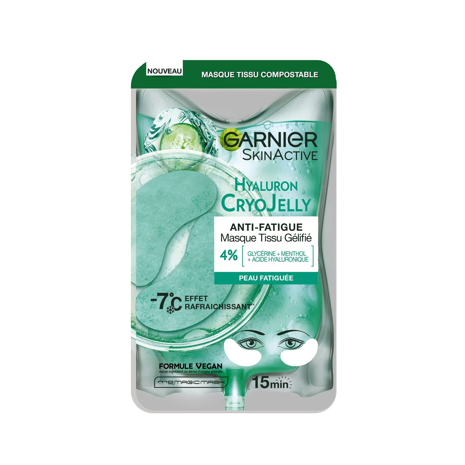 ANTI-FATIGE Augenpads: Die Garnier Hyaluron Cryo Jelly Gel-Augenpflaster verschönern Ihren Blick im Alltag mit einer erfrischenden Gelformel, die für müde Haut geeignet ist.|Ein erwachter Blick: Diese Garnier Augenpflaster bieten ein kühles Gefühl auf der Haut bis zu -7 °C, um Ermüdungserscheinungen, einschließlich Augenringe, zu reduzieren und gleichzeitig die Augenpartie mit Feuchtigkeit zu versorgen.|100 % vegane Formel: Vegan und von Cruelty Free genehmigt. Die Formel dieser Patches ist mit Hyaluronsäure, Glycerin und Menthol angereichert, um die Barriere zu stärken und gleichzeitig die Hauttemperatur zu senken.|15 Minuten Entspannung: Tragen Sie die Pflaster unter den Augen auf die saubere Haut auf und lassen Sie sie 15 Minuten einwirken, bevor Sie sie entfernen. Massieren Sie den Überschuss vorsichtig aus oder entfernen Sie ihn mit einem Wattepad, vorzugsweise wiederverwendbar. Kompostierbares Gewebe.|Veredeln Sie Ihre Haut mit aktiver Hautpolsterung: Entdecken Sie frische und gesunde Haut mit Skin Active, einer Produktreihe für die Gesichtspflege, formuliert mit natürlichen Inhaltsstoffen, um alle Haut zu verschönern.