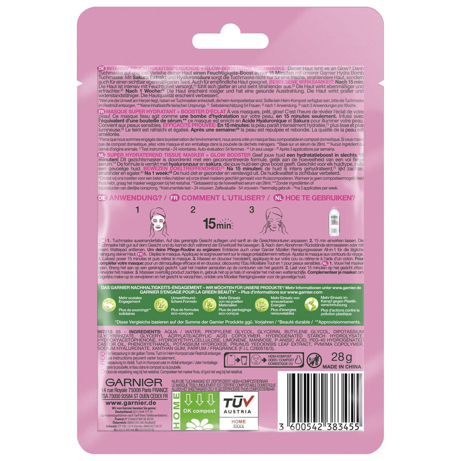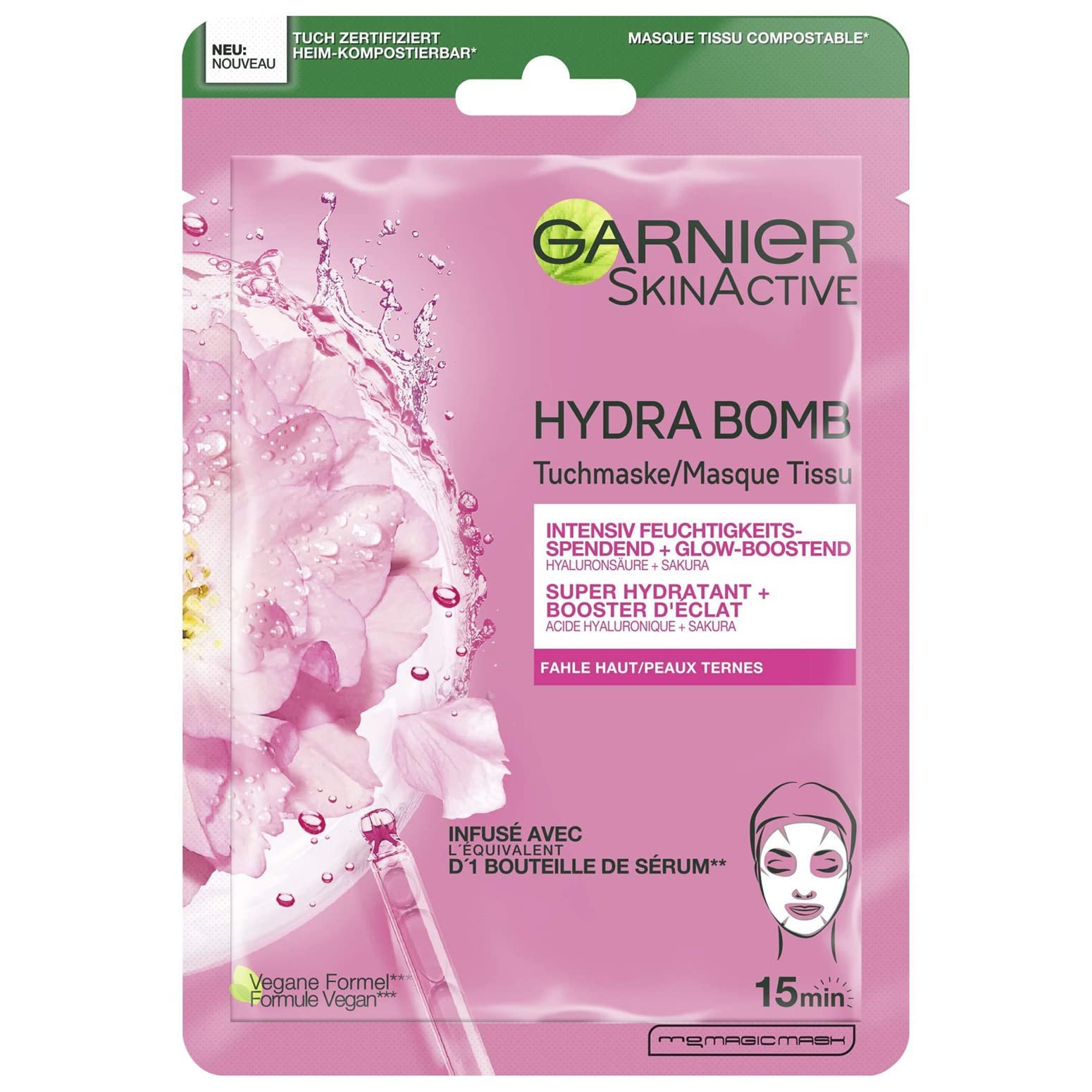 Garnier Hydra Bomb Tuchmaske mit natürlichen Inhaltsstoffen für fahle Haut, Anpassung an jede Gesichtskontur, Aus natürlichem Baumwollgewebe|Ergebnis: Intensive Feuchtigkeit und Pflege für die Haut, Strahlender und gesund aussehender Teint, Straffere Haut, Stärkung der natürlichen Hautschutzbarriere|Anwendung: Weiße Seite der Maske auf das Gesicht auflegen, blaue Folie entfernen, Maske dem Gesicht anpassen und 15 Minuten einwirken lassen, Nach dem Abnehmen sanftes Einmassieren der Rückstände|Formel mit Sakura, natürlichen Inhaltsstoffen, Hyaluronsäure und einem feuchtigkeitsspendenden Serum, Sichtbare Ergebnisse nach 15 Minuten Einwirkzeit|Lieferumfang: 1x Garnier SkinActive Hydra Bomb Tuchmaske mit Sakura und Hyaluronsäure, 28 g