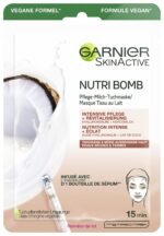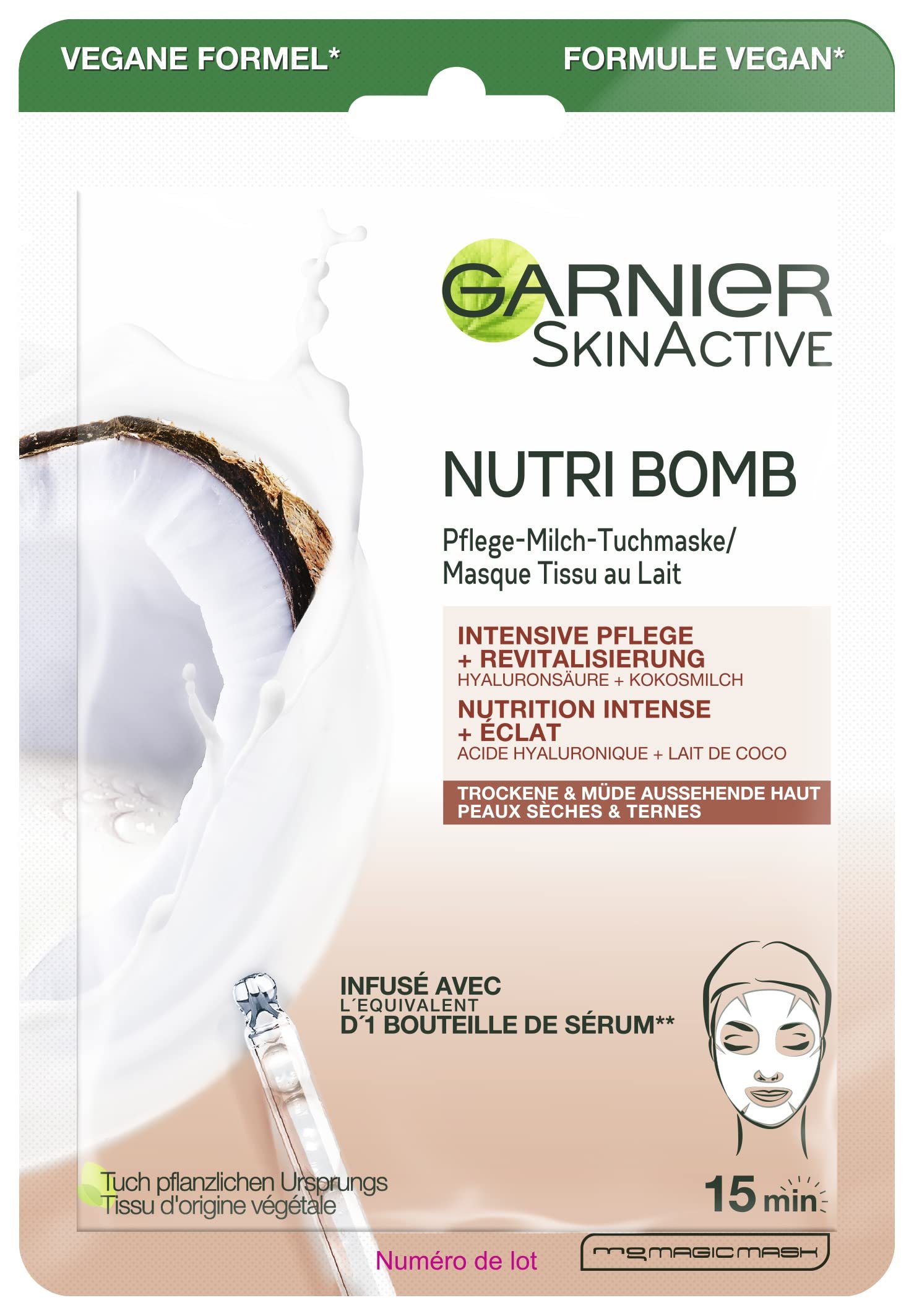 Garnier Nutri Bomb Tuchmaske für trockene und müde Haut, Anpassung an jede Gesichtskontur, Tuch pflanzlichen Ursprungs|Ergebnis: Intensive Feuchtigkeitsversorgung und Pflege, Erfrischende und revitalisierende Wirkung, Verfeinertes Hautbild|Anwendung: Maske auf das gereinigte Gesicht legen, sanft an die Konturen anpassen und 15 Minuten einwirken lassen, Verbleibende Rückstände einmassieren oder mit Wattepad entfernen|Vegane Formel mit Kokosmilch und Hyaluronsäure, Dermatologisch getestetes Serum, Sichtbare Ergebnisse nach 15 Minuten Einwirkzeit|Lieferumfang: 1x Garnier SkinActive Nutri Bomb Tuchmaske mit Kokosmilch und Hyaluronsäure, 28 g