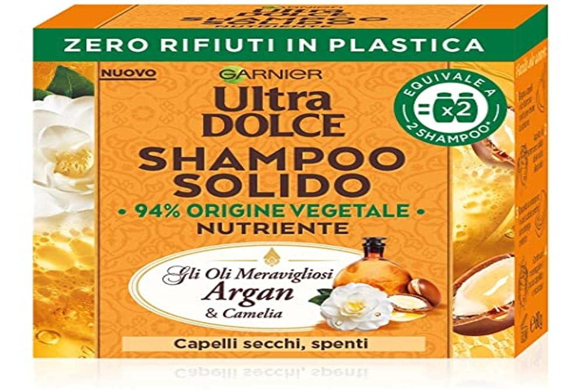 Formuliertes schaumiges festes Shampoo für trockenes und stumpfes Haar, Behandlung, die die natürliche Schönheit der Haare verbessert, umweltfreundliche plastikfreie Verpackung|Für ein tief genährtes Haar, gesund und strahlend aussehend, Geschütztes und glänzendes Haar, leicht zu entwirren, zarte Arganduft und Kamelie|Befeuchten Sie das Haar und das feste Shampoo, um einen leichten Schaum zu erzeugen, tragen Sie das Shampoo von den Wurzeln bis zu den Spitzen auf und massieren Sie die Kopfhaut. Dann mit warmem Wasser abspülen, das Shampoo an einem geschützten Ort aufbewahren|Sanfte und pflegende Formel angereichert mit Argan- und Kamelienöl, 94% Inhaltsstoffe natürlichen Ursprungs und ohne Silikone|Inhalt: 1x Shampoo Solido mit wunderbaren Ölen von Argan- und Kamelienöl Garnier Ultra Dolce, 60 g
