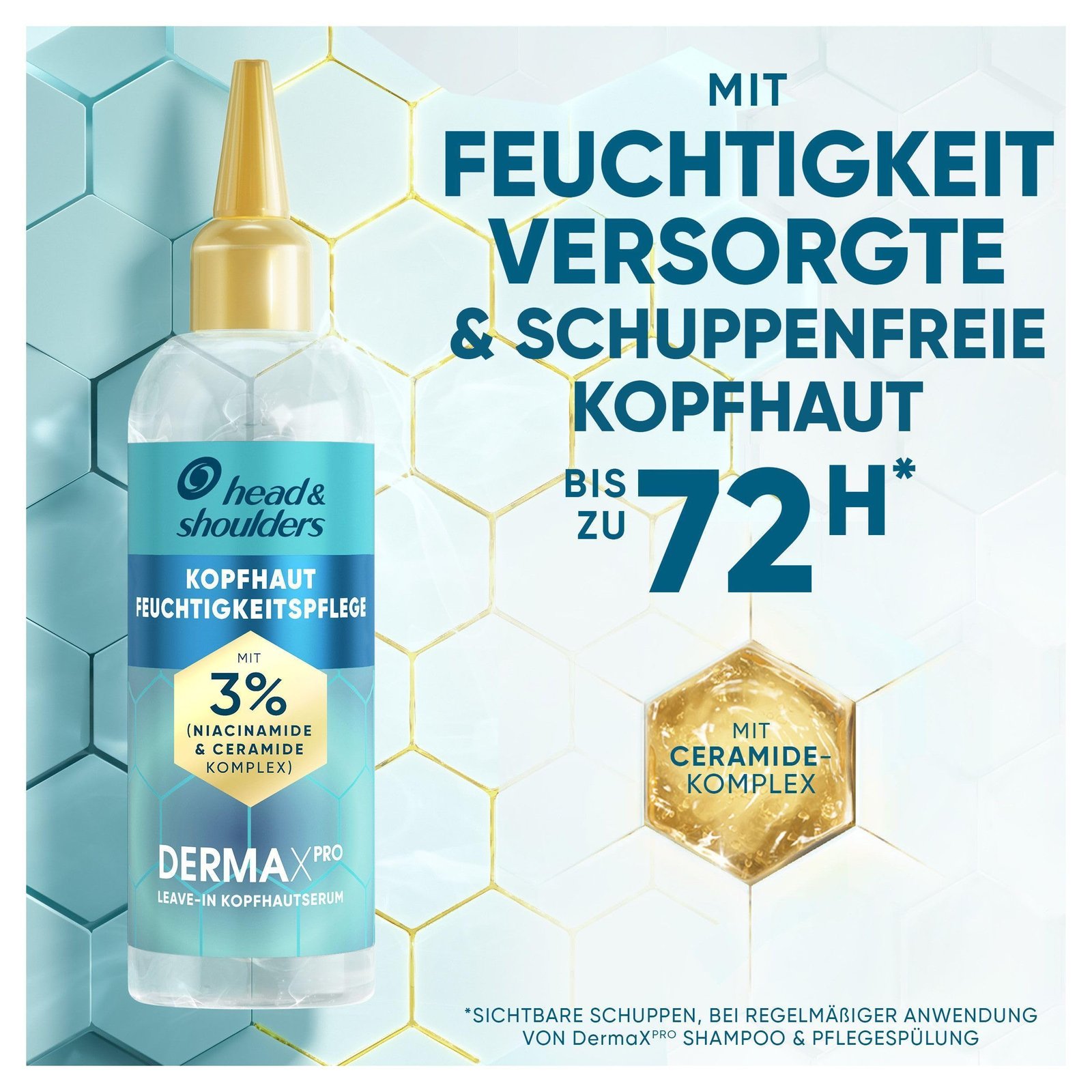 FEUCHTIGKEITSSPENDENDE KOPFHAUTBEHANDLUNG; Bei Anwendung nach dem DermaXPro Anti-Schuppen-Shampoo und der Spülung erhöht diese Leave-In-Kopfhautbehandlung sofort die Feuchtigkeit der Kopfhaut|SPEZIELL FÜR TROCKENE, SPANNENDE KOPFHAUT ENTWICKELT; Unsere Expertenformel wurde speziell für die Pflege trockener, spannender Kopfhaut entwickelt und enthält Niacinamid, Pirocton-Olamin und Ceramid|AUF DIE KOPFHAUT AUFTRAGEN UND NICHT AUSSPÜLEN; Unsere leichte Leave-In-Feuchtigkeitspflege für die Kopfhaut spendet trockener, schuppiger Kopfhaut sofort Feuchtigkeit und hilft, trockene Haut zu pflegen und zu reparieren, ohne sie zu beschweren|IHRE FEUCHTIGKEITSROUTINE FÜR DIE KOPFHAUT; Nach dem Head & Shoulders DermaXPro Repairing Moisture Anti-Schuppen-Shampoo und der Spülung hilft unsere Kopfhaut-Feuchtigkeitspflege, der Haut Feuchtigkeit zu spenden (bei regelmäßiger Anwendung)|DERMATOLOGISCH GETESTET; Diese DermaXPro Expertenpflege für die Kopfhaut ist sanft zu Ihrer Kopfhaut und Ihrem Haar|BEKÄMPFEN SIE TROCKENE KOPFHAUT AN DEN WURZELN; Der Düsenaufsatz hilft, trockene Stellen an der Kopfhaut gezielt zu behandeln, sodass Sie die Haut genau dort mit Feuchtigkeit versorgen können, wo sie am meisten benötigt wird