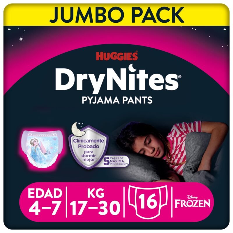 Huggies DryNites hochabsorbierende Pyjamahosen Unterhosen für Mädchen, Jumbo Monatspackung, 4-7 Jahre, (1 Packung von 16)