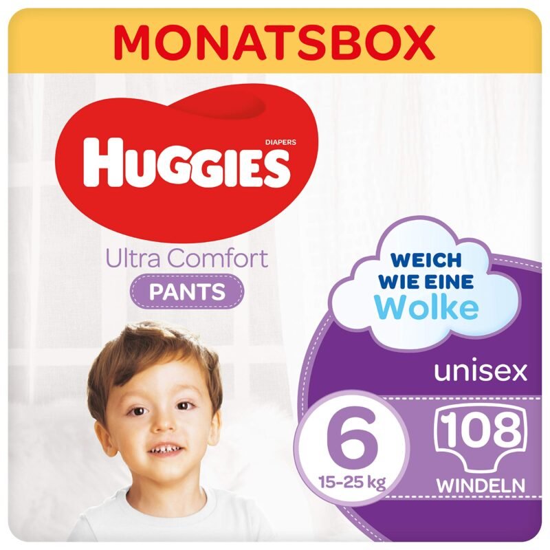 Atmungsaktive Windelhosen Größe 6 für Babys und Kleinkinder ab dem Krabbelalter mit einem Gewicht von 15 bis 25 kg; Schutz und Komfort; Ideale Packung für 1 Monatsverbrauch|Höschenwindeln mit einzigartiger Saugfähigkeit; Sekundenschnelle Flüssigkeitsaufnahme für anhaltend trockene Haut; Farbwechselnder Nässeindikator als Hinweis zum Windelwechseln|Rundum-Passform: Windelhöschen mit einem Tragegefühl fast wie Unterwäsche; Elastische Beinbündchen und besonders weiches Taillenbündchen für mehr Komfort und perfekten Halt ohne Einschneiden am empfindlichen Bauch|Einfaches An- und Ausziehen; Aufreißbare Seiten und Klebeband zur einfachen Entsorgung; Parfümfrei und frei von Naturkautschuklatex|Lieferumfang: Huggies Ultra Comfort Pants Größe 6; Vorratspack; 4 x 27 Stück = 108 Windel-Pants insgesamt; Verpackungsgröße: 48 x 30 x 30 cm; Verpackungsgewicht: 4,5 kg; Farbe: Weiß; Art: 2560211