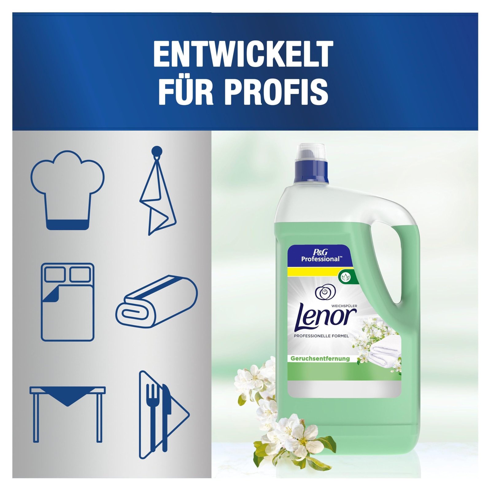 Entwickelt, um langanhaltende Frische und Weichheit in Ihre gewerbliche Wäsche zu bringen|Beeinhaltet spezifische Weichheitstechnologien auf pflanzlicher Basis, die die Fasern vor Schäden schützt und die Lebensdauer der Wäsche verlängern|Wirkt auch nach dem Trocknen im Wäschetrockner|Reduziert die statische Aufladung von Stoffen und macht Wäsche leichter bügelbar|Klassisches Bouquet eines neutral-frischen Morgendufts, erfrischt durch belebende Kopfnoten|Recycelbarer Flaschenkörper, hergestellt mit erneuerbareren Energien