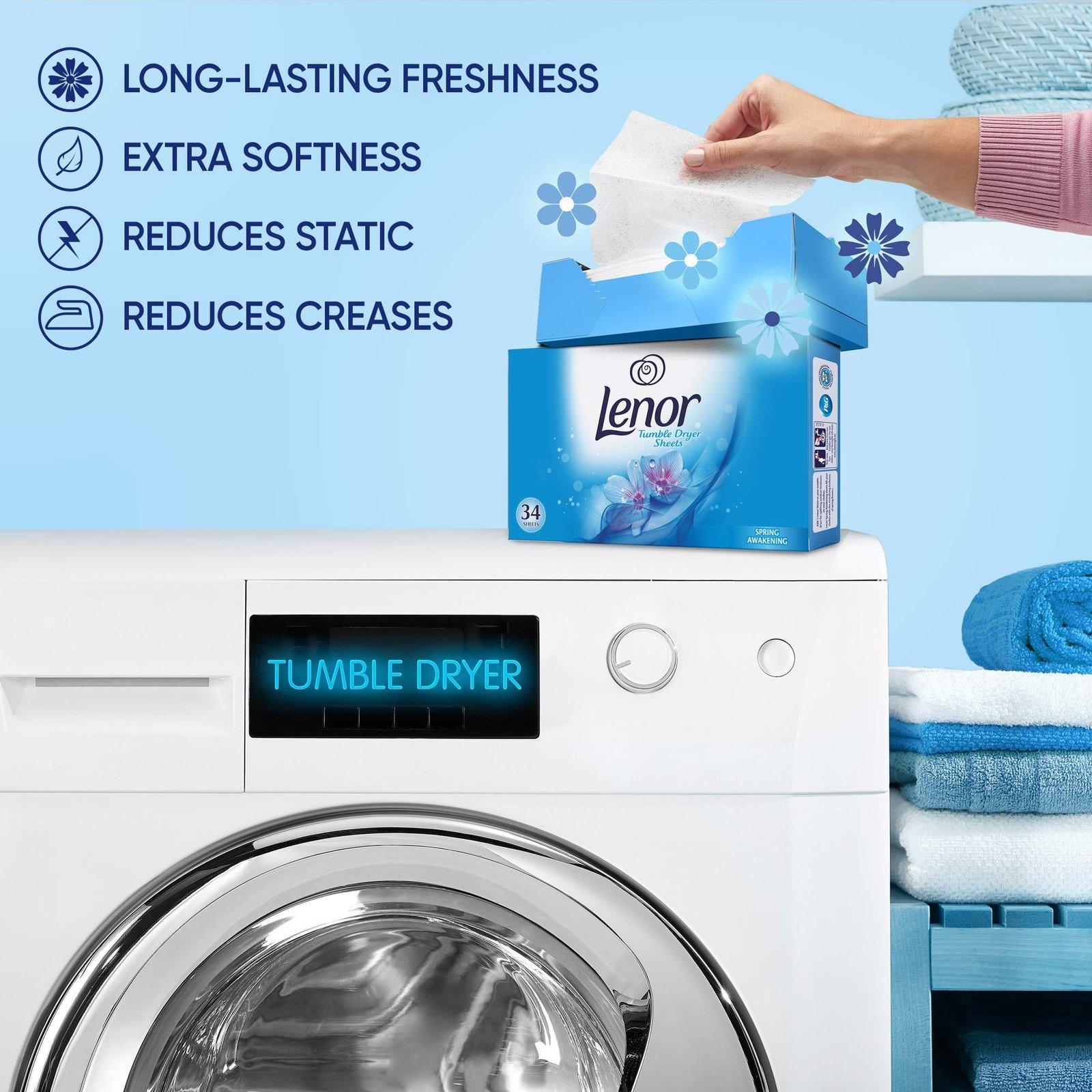 Weichspüler speziell für Ihren Wäschetrockner|Es hilft, Ihre Kleidung, Handtücher und Bettwäsche vor Faltenbildung, Statik und Frischeverlust durch die Hitze des Wäschetrockners zu schützen|Legen Sie einfach eines dieser Laken in Ihren Wäschetrockner und Ihre Kleidung fühlt sich so frisch an, als hätte sie draußen an der Wäscheleine aufgehängt|Wäschetrocknertücher|Schützt Ihre Wäsche vor statischer Aufladung|Hält Kleidung frisch riechend|Frischer Frühlingserwachender Duft|Früher bekannt als Bounce