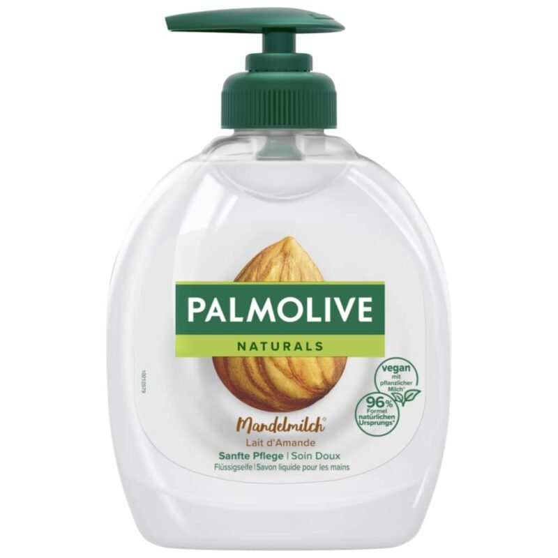 Palmolive flüssige Handseife Milch & Mandel mit Milchproteinen und Mandelöl-Duft|Für zarte Pflege Ihrer Hände dank einzigartiger Kombination aus milden Waschsubstanzen & hautpflegenden Inhaltsstoffen|96% der Formel natürlichen Ursprungs (Wasser und natürlich gewonnene Inhaltsstoffe mit minimaler Verarbeitung|95% biologisch abbaubare Formel (bezogen auf die organischen Inhaltsstoffe)|Die Handseife basiert auf einer sanften, seifenfreien Formel|Für alle Hauttypen geeigent, dermatologisch getestet|Lieferumfang: 1 x 300ml flüssige Handseife Palmolive Naturals Milch & Mandel