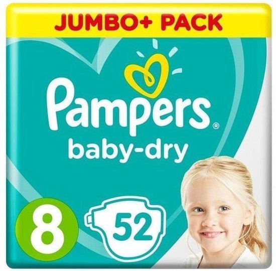 Pampers Baby-Dry Größe 8, 52 Windeln, 17+kg, Jumbo+ Pack, Luftkanäle für atmungsaktive Trockenheit über Nacht