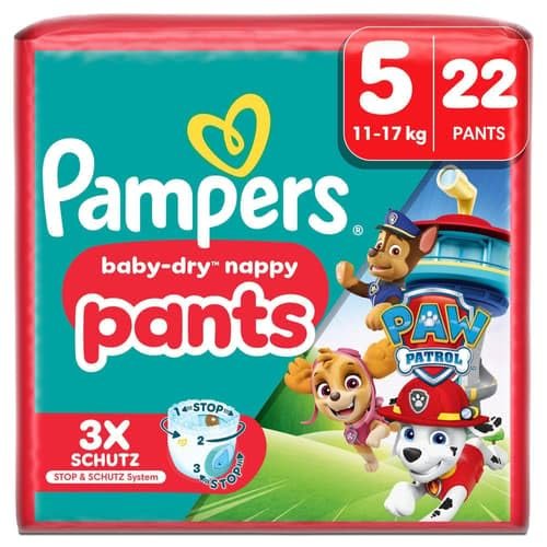 Pampers Baby-Dry Pants Paw Patrol Edition Gr.5, Single Pack, 11-17kg360° Passform schützt dich und dein Baby vor Auslaufen! Unsere auslaufsicheren Baby-Dry Pants mit deinen Lieblingsfiguren aus Paw Patrol! Die 2x breiteren* Beinbündchen verhindern Auslaufen rundum die Beinchen, das Stop & Schutz Täschchen verhindert Auslaufen am Rücken, während die 360° Passform sich den Bewegungen deinen Babys anpasst für bis 12 Stunden Rundum-Auslaufschutz, Tag & Nacht. Wie all unsere Pants lassen sich auch Pampers Baby-Dry Paw Patrol Pants leicht wechseln, selbst wenn dein Baby sich bewegt: Zum Anziehen hochziehen, zum Ausziehen die Seitenbündchen aufreißen, einrollen und einfaches Entsorgen dank Klebestreifen. Genau wie für dich steht die Sicherheit deines Babys auch für Pampers an erster Stelle: Pampers Baby-Dry Paw Patrol Pants sind dermatologisch getestet und enthalten 0% EU-Parfümallergene (gemäß EU-Kosmetikverordnung Nr. 1223/2009). Sie sind von Dermatologen der Skin Health Alliance bestätigt und gemäß STANDARD 100 von OEKO-TEX getestet und zertifiziert. Möchtest du mehr über die Bestandteile unserer Produkte erfahren? Besuche uns auf pampers.de, pampers.at und pampers.ch. *vorher.Produkteigenschaften:-Paw Patrol Limited Edition, mit PAWsome Designs-Stop & Schutz Täschchen hilft, Auslaufen am Rücken zu verhindern-360° Passform passt sich den Bewegungen deines aktiven Babys an-Mit einem super saugfähigen Kern, der Flüssigkeit sofort absorbiert-Einfaches Windelwechseln: zum Anziehen hochziehen, zum Ausziehen die Seitenbündchen aufreißen, einrollen und dank Klebestreifen einfach entsorgen-Skin Health Alliance bestätigt, dass Pampers Pants bei Kontakt mit Babyhaut sicher sind-Mit Pampers Feuchttüchern verwendenAchtung:Alle Verpackungsmaterialien von Babies und Kindern fernhalten um Erstickungs- und/oder Erdrosselungsgefahr zu vermeiden.Hersteller:Procter&Gamble GmbH, Sulzbacher Str. 40-50. 65824 Schwalbach