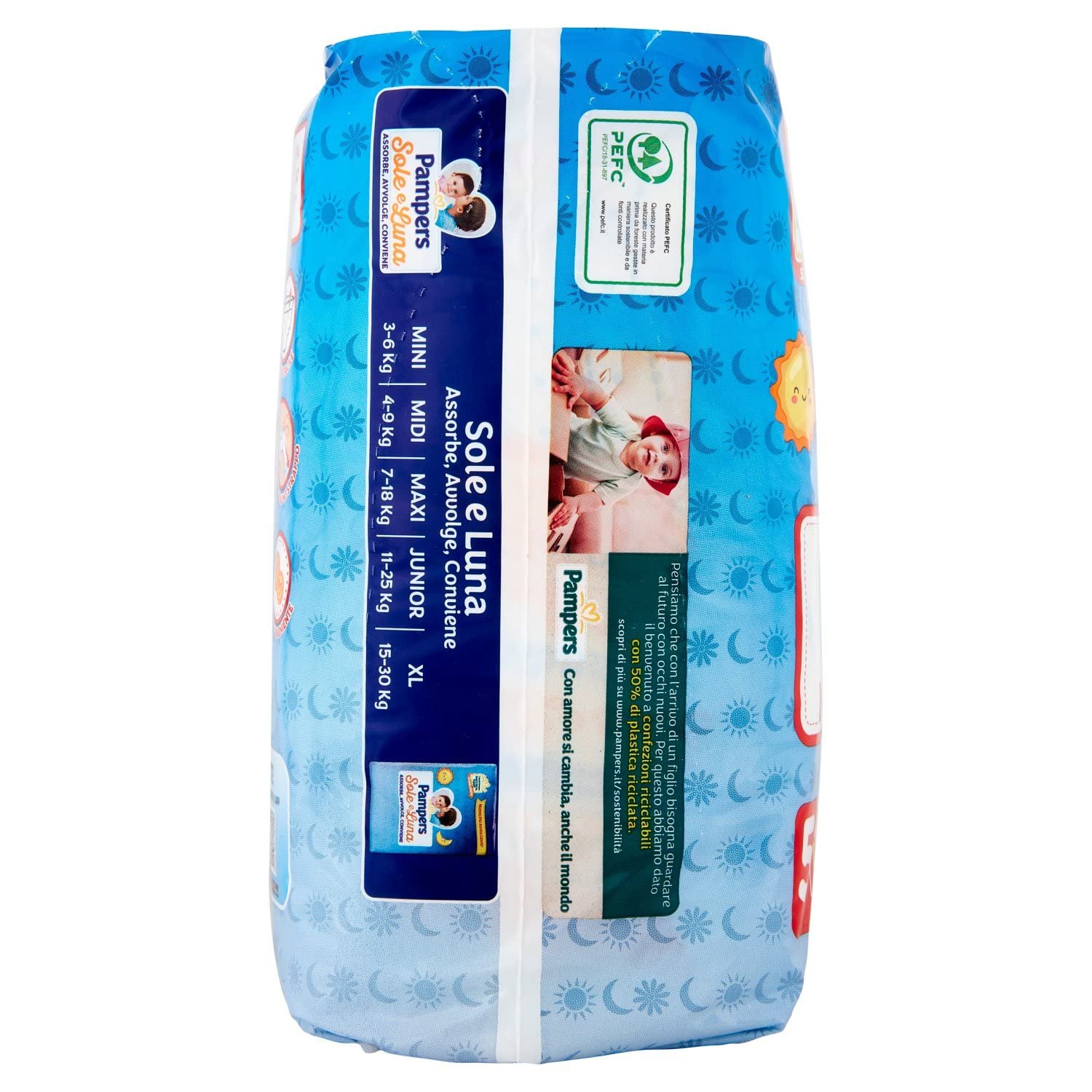 Die Pampers Windeln Sole und Luna sind noch saugfähiger und günstiger|Ausgestattet mit einer optimalen Passform, haben die Pampers Sole und Luna neue und noch elastischere und robuste Ohren vorne und hinten für eine bessere Wicklung|Ausgestattet mit Pipi absorbierenden Mikrogranulaten, die ein Auslaufen verhindern und Feuchtigkeit von der Haut Ihres Babys fernhalten, dank der noch dichteren saugfähigen Webart|Die filternde und saugfähige Struktur ist mit Aloe Vera und Kamillenessenz angereichert, die Schutz vor Hautreizungen bieten