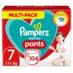 Pampers Windeln Pants Größe 7 (17kg+) Baby-Dry, Extra Large mit Stop- und Schutz Täschchen, MONATSBOX, 104 Höschenwindeln