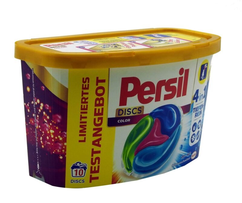 Persil Discs in einer innovativen 4-Kammer-Scheibe. Die in vier separaten Kammern eingeschlossenen Wirkstoffe entfalten ihre doppelte Kraft und sorgen für perfekte Waschergebnisse. Die technologisch fortschrittliche Persil Discs Waschscheibe enthält doppelt konzentriertes Flüssigwaschmittel. Persil Discs bestehen aus einer empfindlichen Folie, die sich unter dem Einfluss von Wasser vollständig auflöst. Dadurch verbinden sich die vier separaten Waschmittelformeln, die in separaten Kammern eingeschlossen sind, erst dann miteinander, wenn die Persil-Kapsel in der Waschtrommel mit Wasser in Kontakt kommt.