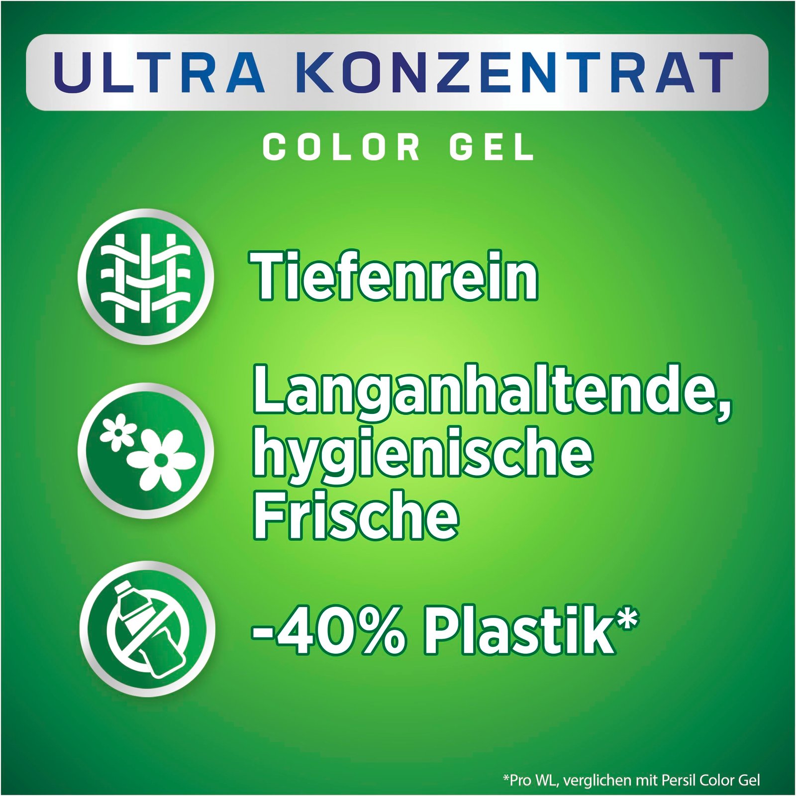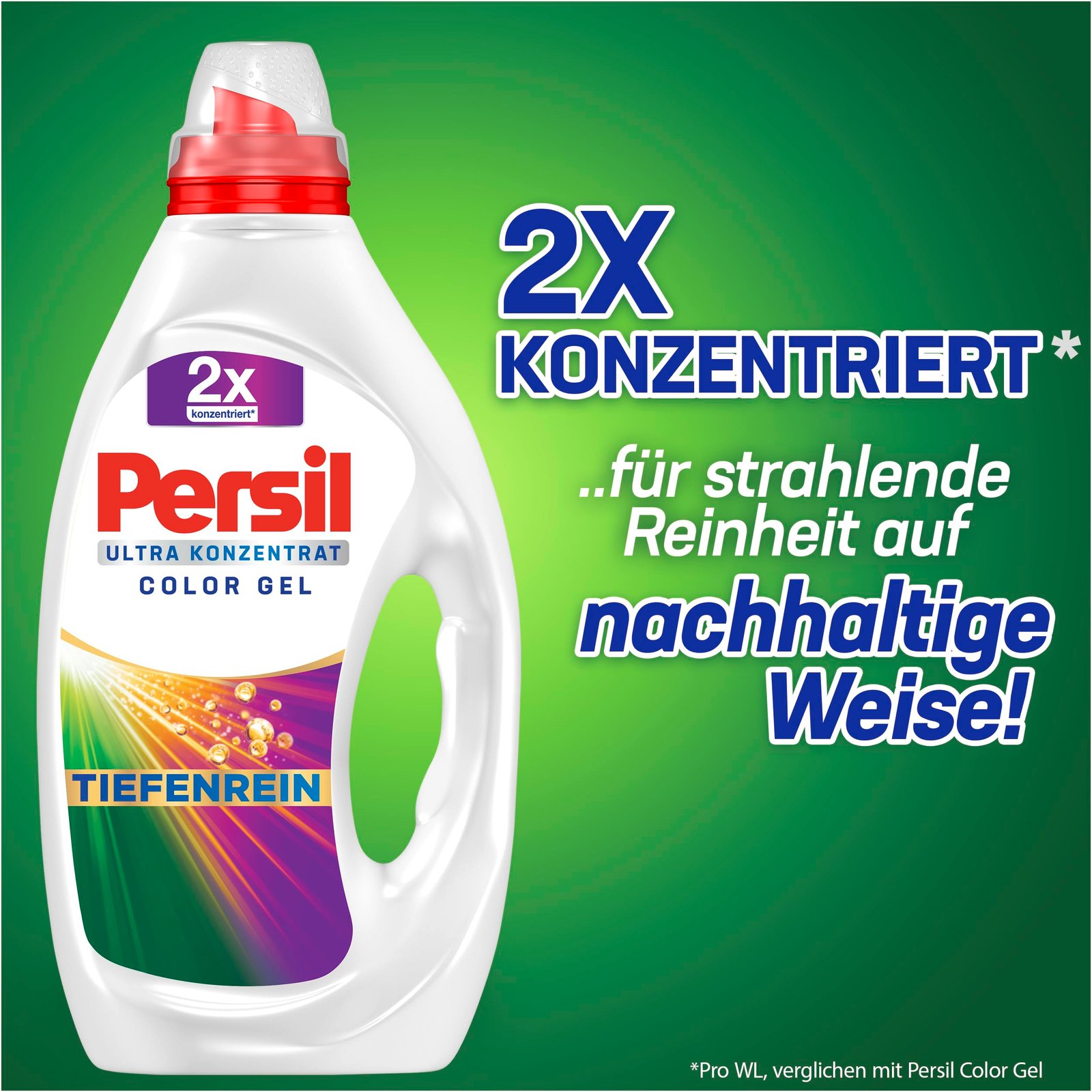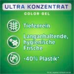 Tiefenrein-Plus – Dank Tiefenrein-Plus Technologie dringt das Gelwaschmittel tief in die Fasern ein und bekämpft selbst hartnäckigste Flecken und unsichtbare Verschmutzungen|Langanhaltende Frische – Mit Hygienische-Frische-Effekt wirkt das Flüssigwaschmittel effektiv gegen Gerüche und hinterlässt nichts als langanhaltend frische Textilien|Strahlende Reinheit – Neben hygienischer Sauberkeit hält die hochwertige Formel des Waschmittels bunte Wäsche strahlend leuchtend – sogar nach mehreren Wäschen|Hochkonzentrierte Formel – Das Color Waschmittel hat eine hochkonzentrierte ergiebige Formel, sodass eine 1,2 l Flasche für 62 Waschladungen oder 5 Monate ausreicht|Für eine saubere Welt – Eine Flasche PERSIL Waschkonzentrat enthält 40% weniger Plastik und wirkt auch bei niedrigen Wassertemperaturen