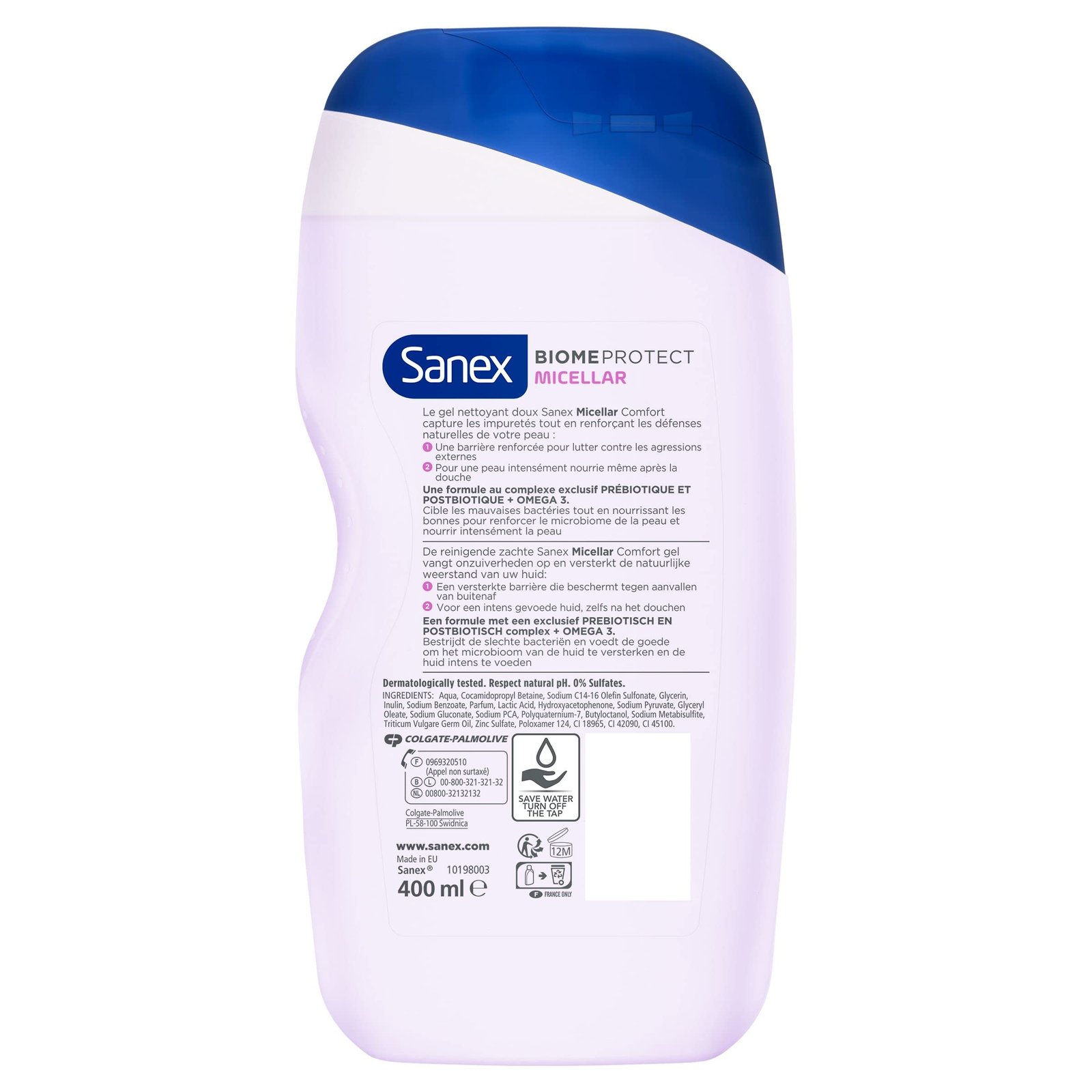 Ein schützendes und beruhigendes Duschgel: Das Sanex BiomeProtect Micellar Comfort Duschgel reinigt sanft und schützt die Haut und beruhigt gleichzeitig Trockenheit der Haut dank seiner angereicherten Omega 3-Formel.|Hautfreundlich: Die Formel dieses sulfatfreien Duschgels trägt dazu bei, die oberen Schichten der Epidermis mit Feuchtigkeit zu versorgen und die guten Bakterien des Hautmikrobioms zu nähren, die erste Verteidigungslinie der Haut.|Innovative Formel: Dieses Duschgel mit fortschrittlicher Formel enthält einen exklusiven Komplex aus Präbiotika und Postbiotika, um das Mikrobiom der Haut zu stärken und es effektiver gegen äußere Einflüsse zu machen.|Anwendung: Verwenden Sie dieses Duschgel für Damen und Herren nach Ihren Gewohnheiten, wie jedes klassische Waschmittel. Nach dem Waschen gründlich mit klarem Wasser ausspülen und Augenkontakt vermeiden.|Experten für gesunde Haut: Die Marke Sanex hilft Ihnen, Ihre Haut gesund zu halten, dank ihrer breiten Palette an Hygieneprodukten mit nicht-aggressiven Formulierungen, die dazu beitragen, Ihre Haut täglich zu pflegen.