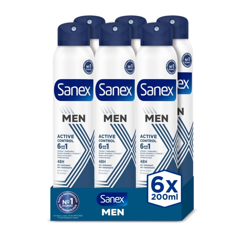 Sanex Men Active Control Deospray für Männer, 6er Pack (6 x 200 ml) 48H Schutz, Anti-Transpirant, Anti-Reizung, 0% Alkohol, Bekämpfung von schlechtem Geruch, langanhaltend