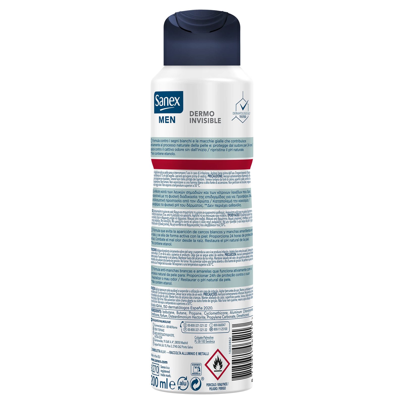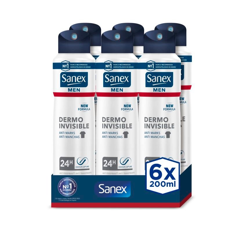 Sanex Men Dermo Invisible Deodorant für Herren, 6 Stück x 200 ml, 24H-Schutz, Antitranspirant, Anti-Reizung, 0% Alkohol, gegen weiße Flecken, bekämpft schlechten Geruch