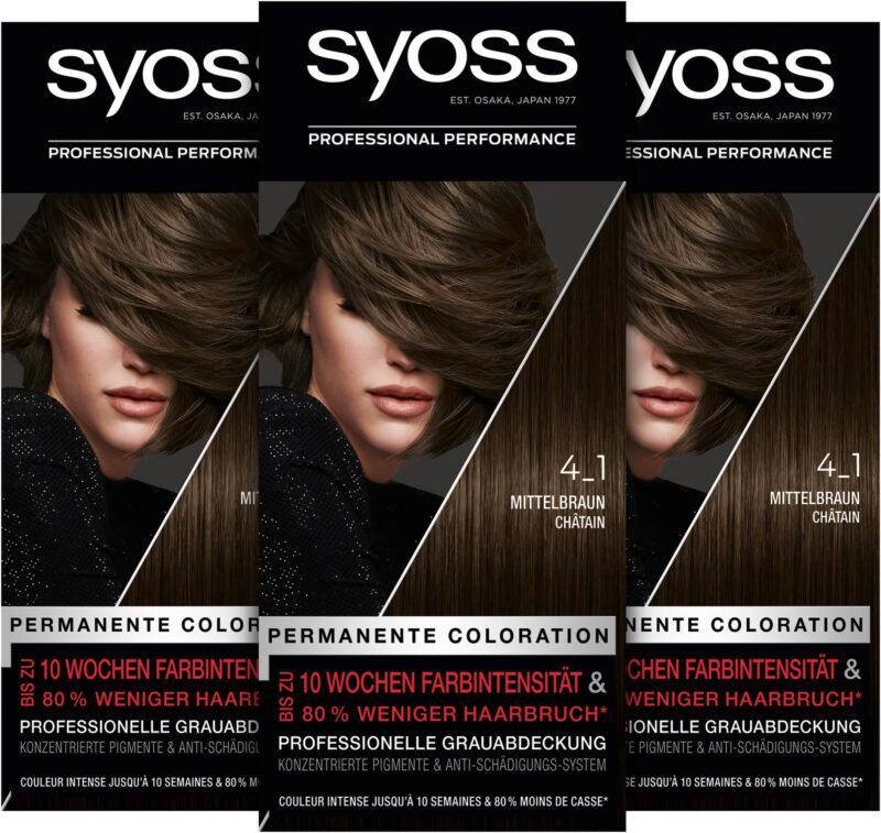 Syoss Color Coloration 4_1 Mittelbraun Stufe 3 (3 x 115 ml), permanente Haarfarbe für bis zu 10 Wochen Farbintensität und 70% weniger Haarbruch*