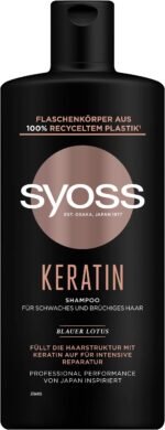 Für brüchiges Haar – Das Syoss Shampoo Keratin eignet sich für schwaches und brüchiges Haar und füllt es mit Keratin auf|Hair Repair Wirkung – Mithilfe von Keratin werden die Haare für eine Tiefenreparatur aufgefüllt, die Haarfaser wird geglättet|Starkes Haar – In dem Shampoo vereinen sich der natürliche, asiatisch inspirierte Inhaltsstoff Blauer Lotus mit einem Amino-Komplex; für starkes, gesund aussehendes Haar|Inhaltsstoffe natürlichen Ursprungs – Das Keratin Shampoo enthält 90 % Inhaltsstoffe natürlichen Ursprungs, inklusive Wasser|100 % recyceltes Plastik – Der Flaschenkörper des Shampoos besteht aus 100 % recyceltem Plastik (Kappe ausgenommen)