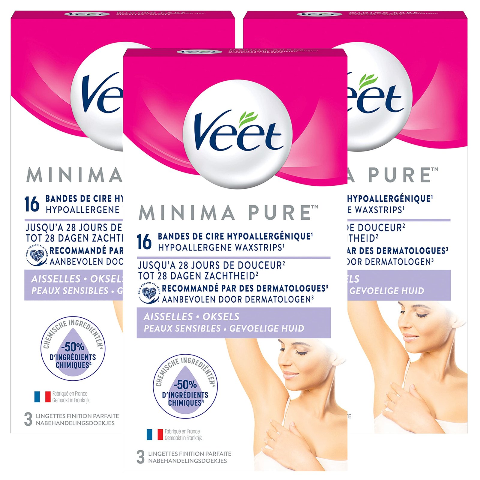 Minima Pure Kaltwachs – Die Minima Pure Wachsbänder sind hypoallergen, transparent und parfümfrei. Sie sind mit -50 % chemischen Inhaltsstoffen und nur 5 Inhaltsstoffen formuliert. Enthält 3 Sets mit 16 Wachsstreifen und 3 Tüchern für ein perfektes Finish.|Effektiv auf kurzen Haaren – Die Minima Pure Kaltwachsstreifen wurden entwickelt, um kurze Haare ab 1,5 mm zu entfernen, also müssen Sie nicht so lange warten, bis Sie wieder enthaaren. Mit den Wachsstreifen von Minima Pure erhalten Sie eine weiche Haut, ohne von unansehnlichem Nachwachsen gestört zu werden|EINFACHE ANWENDUNG – Die Veet Wachsstreifen sind gebrauchsfertig und ermöglichen es Ihnen, Ihre Haare schnell loszuwerden, ohne das Wachs in der Mikrowelle erwärmen zu müssen. Reiben Sie einfach den Wachsstreifen zwischen Ihren Händen, um das Wachs zu erwärmen und es ist einsatzbereit!|LANGE ERGEBNISSE – Durch die regelmäßige Enthaarung mit Wachs wachsen Ihre Haare weniger, feiner und weicher. Genießen Sie also eine lang anhaltende Weichheit und seien Sie sicher, dass Ihre Haare nicht dicker nachwachsen|Veet QUALITÄT – Dank seiner Easy-Gelwax-Technologie entfernt das Wachs selbst die kürzesten Haare (1,5 mm) und bietet Ihnen eine Weichheit von bis zu 28 Tagen. Die feuchtigkeitsspendende Formel sorgt dafür, dass Ihre Haut mit Feuchtigkeit versorgt und weich ist. Die Veet Serie passt sich jedem Hauttyp an.