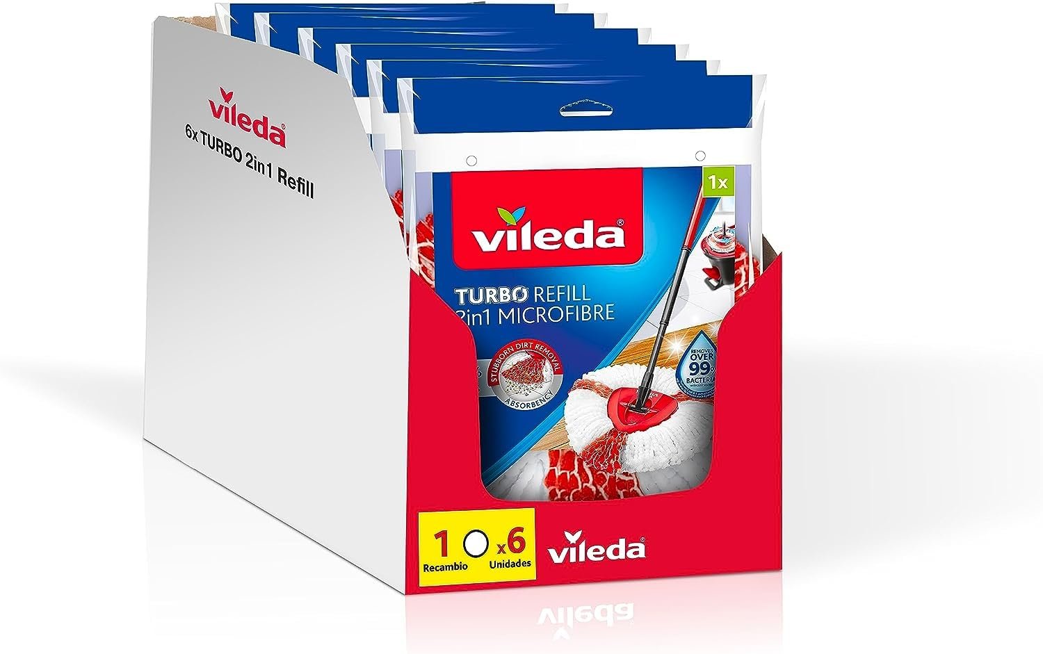 Vileda -2-in-1 Turbo Ersatz; kompatibel mit Allen Vileda Turbo Systemen; 20% zusätzliche Leistung; geeignet für alle Arten von harten Böden; entfernt 99% der Bakterien nur mit Wasser; 6 Stück
